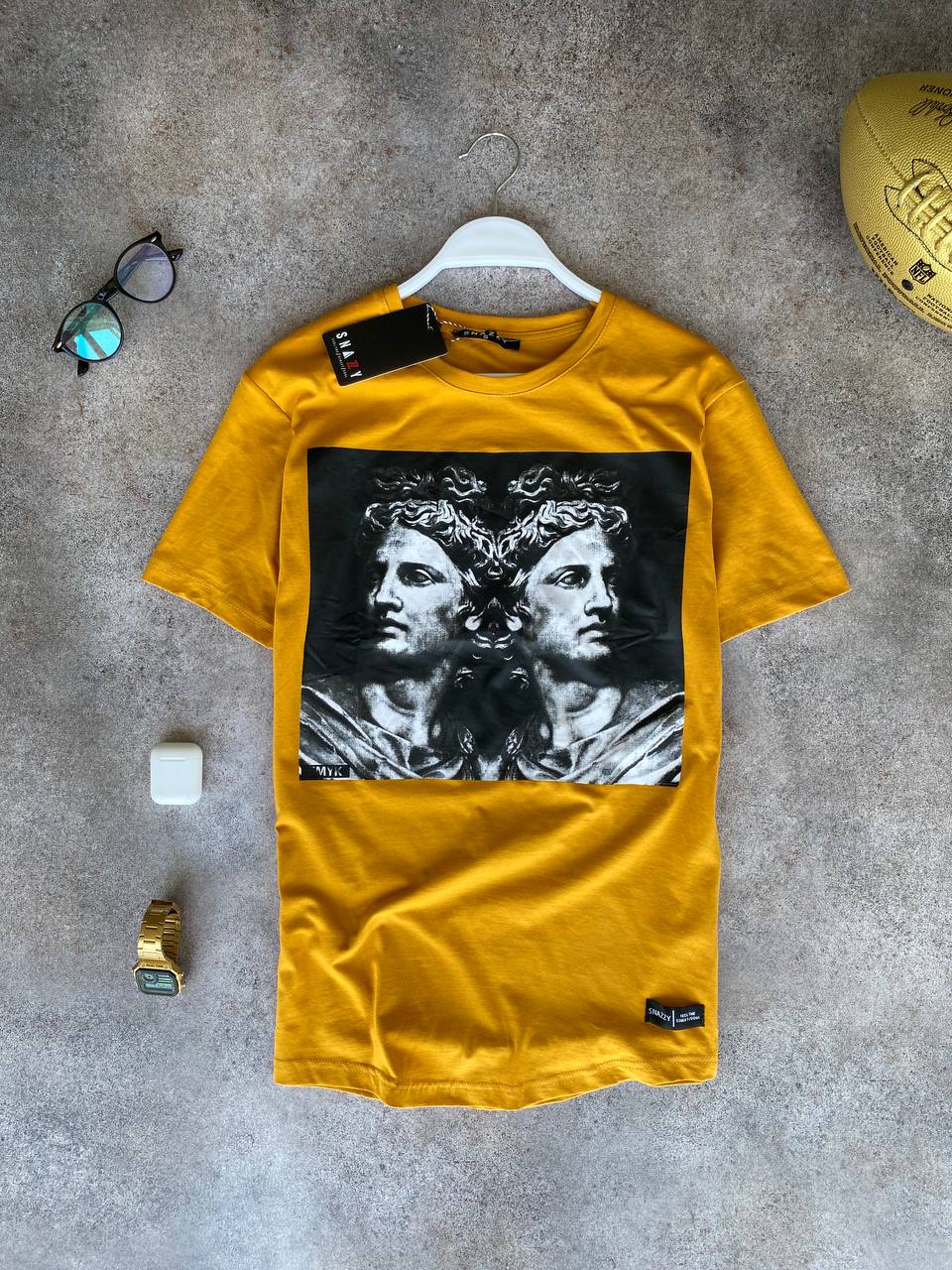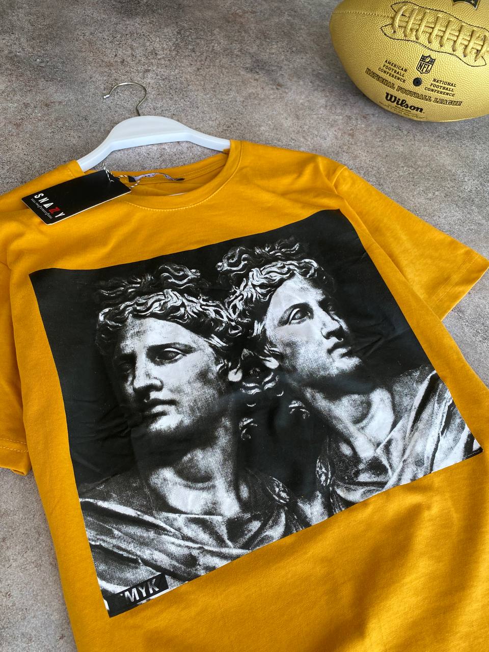 Мужская Желтая Футболка Оверсайз – Свободного Кроя Модная с Принтом Статуи