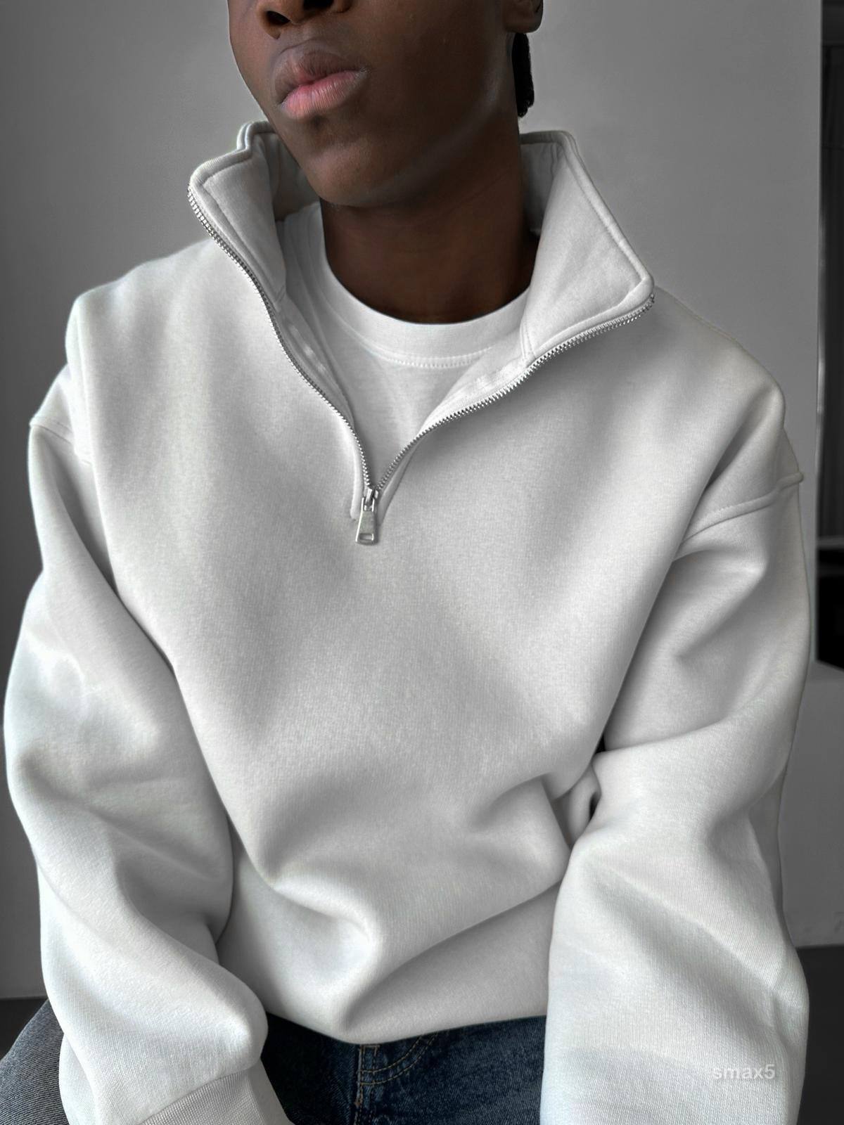 Мужская Базовая Белая Кофта Свитшот Свободного Кроя с Высоким Горлом на Замке