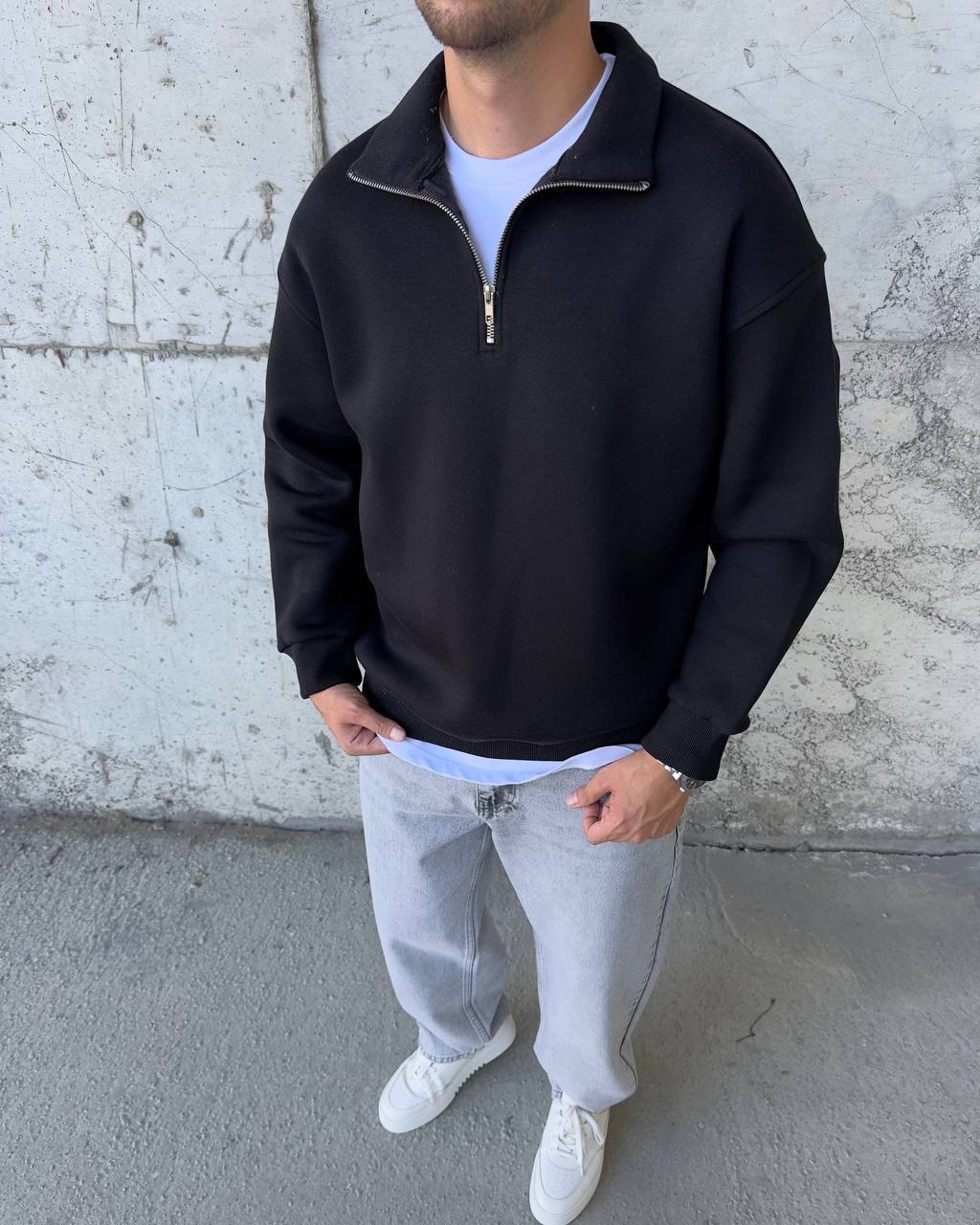 Мужская Базовая Черная Кофта Свитшот Оверсайз с Высоким Воротником Зип