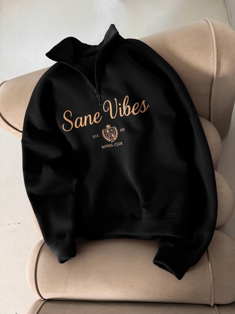 Мужская Черная Кофта “Sane Vibes” с Коротким Замком под Горло – Теплая с Начесом