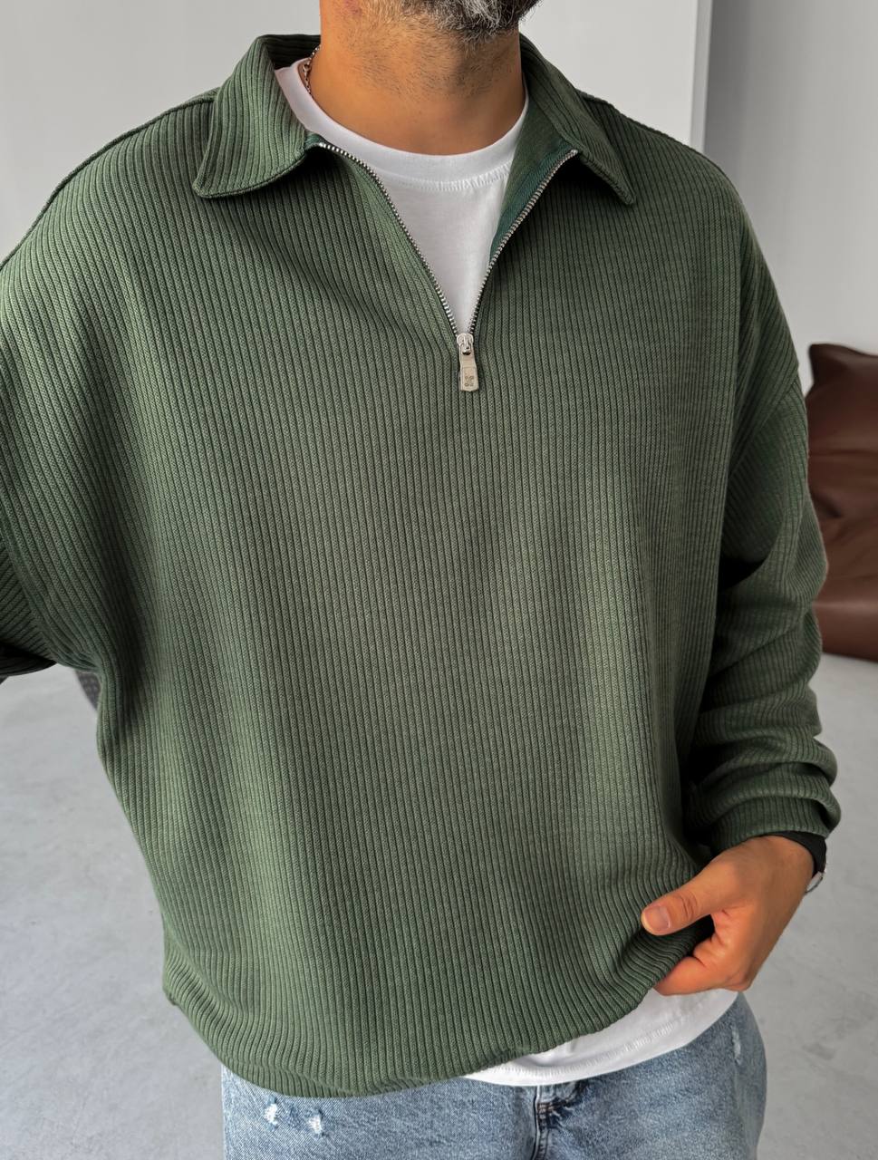 Мужская Свободная Зеленая Кофта в Рубчик – Свитшот Оверсайз с Воротником Поло на Замке