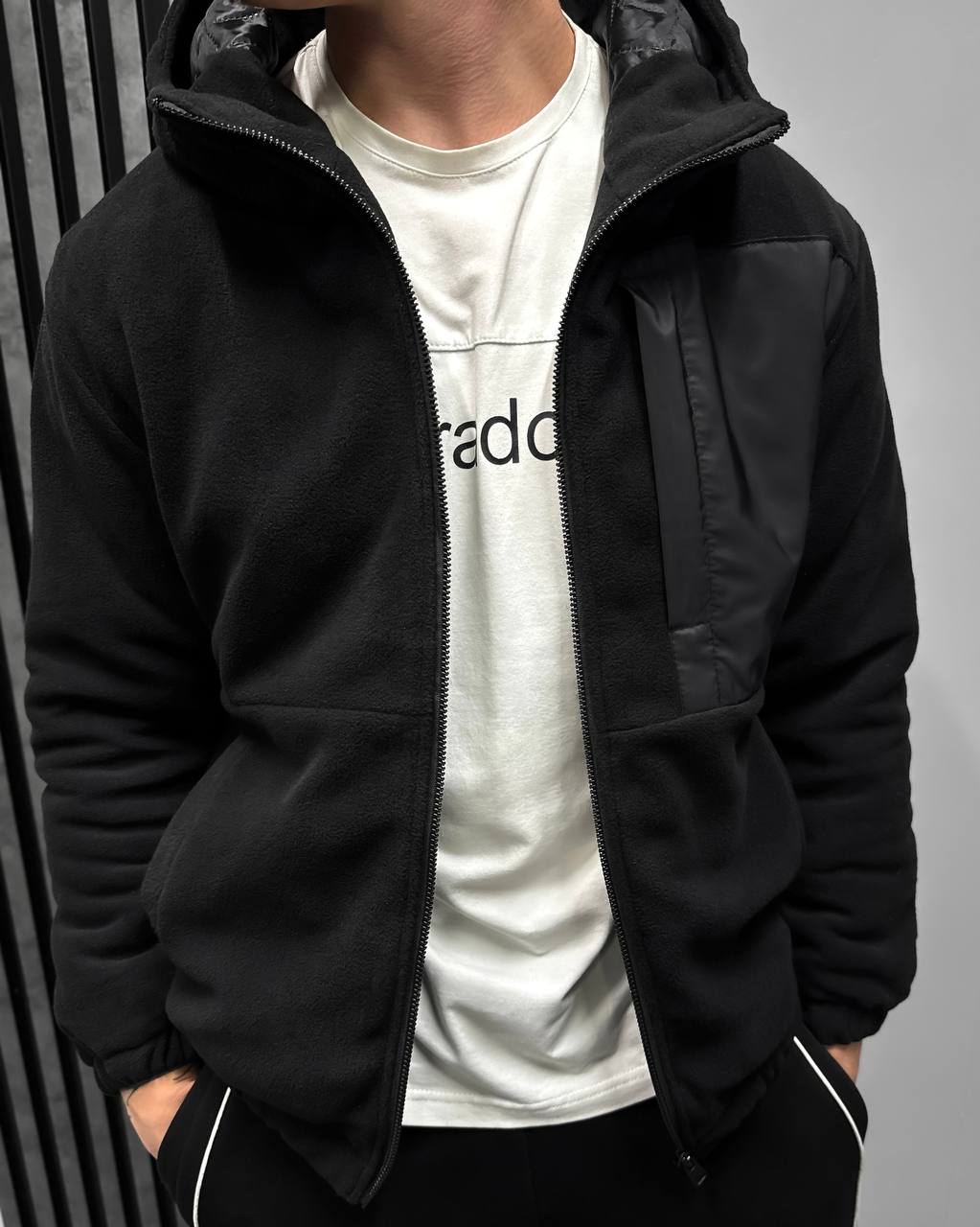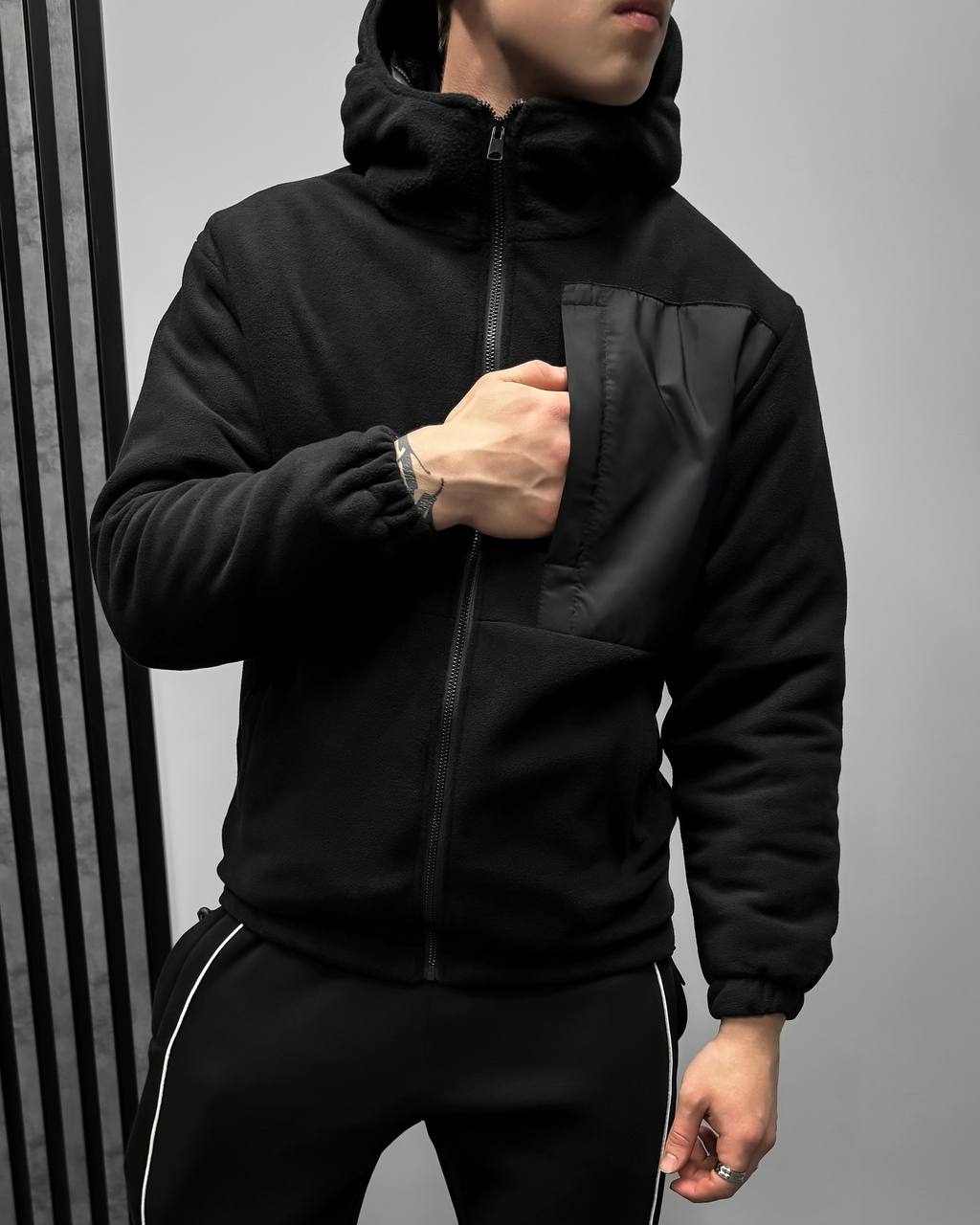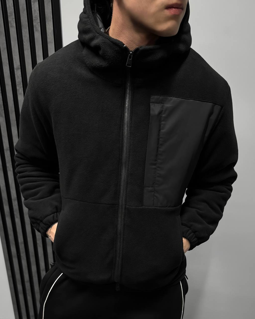 Мужская Теплая Флисовая Черная Кофта с Капюшоном – Свободная Флиска на Молнии