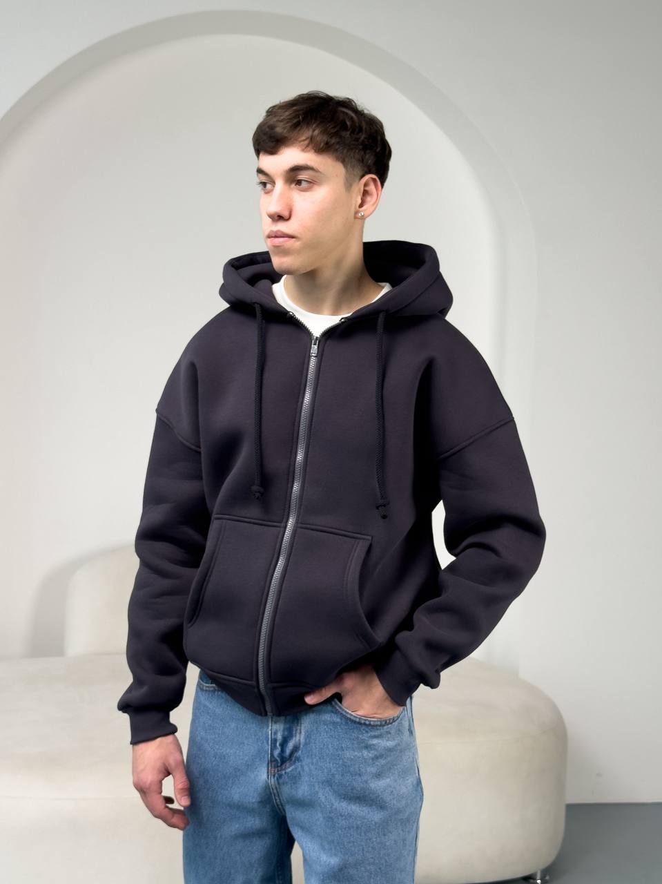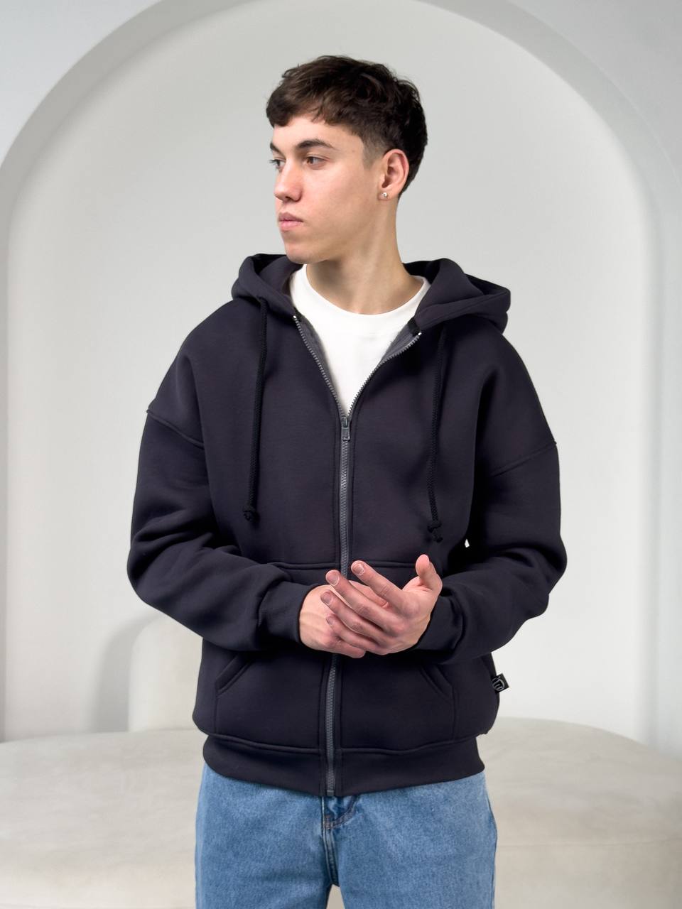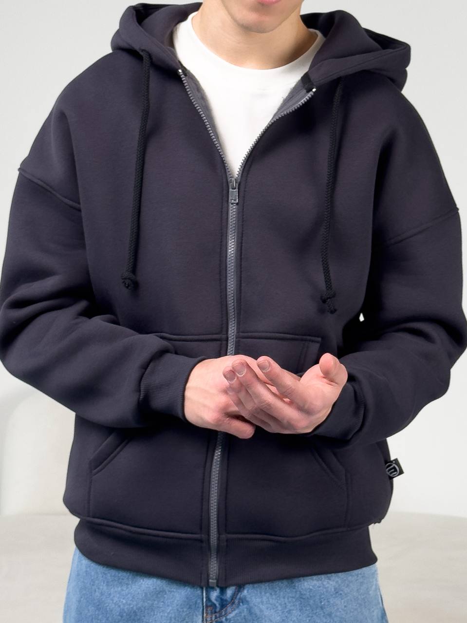 Мужская Теплая Графитовая Кофта Зипка на Флисе – Худи Свободного Кроя на Молнии