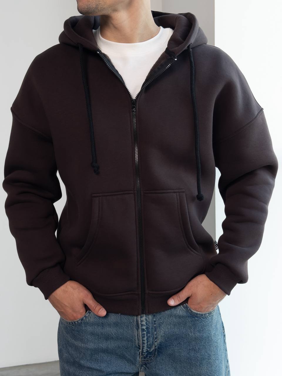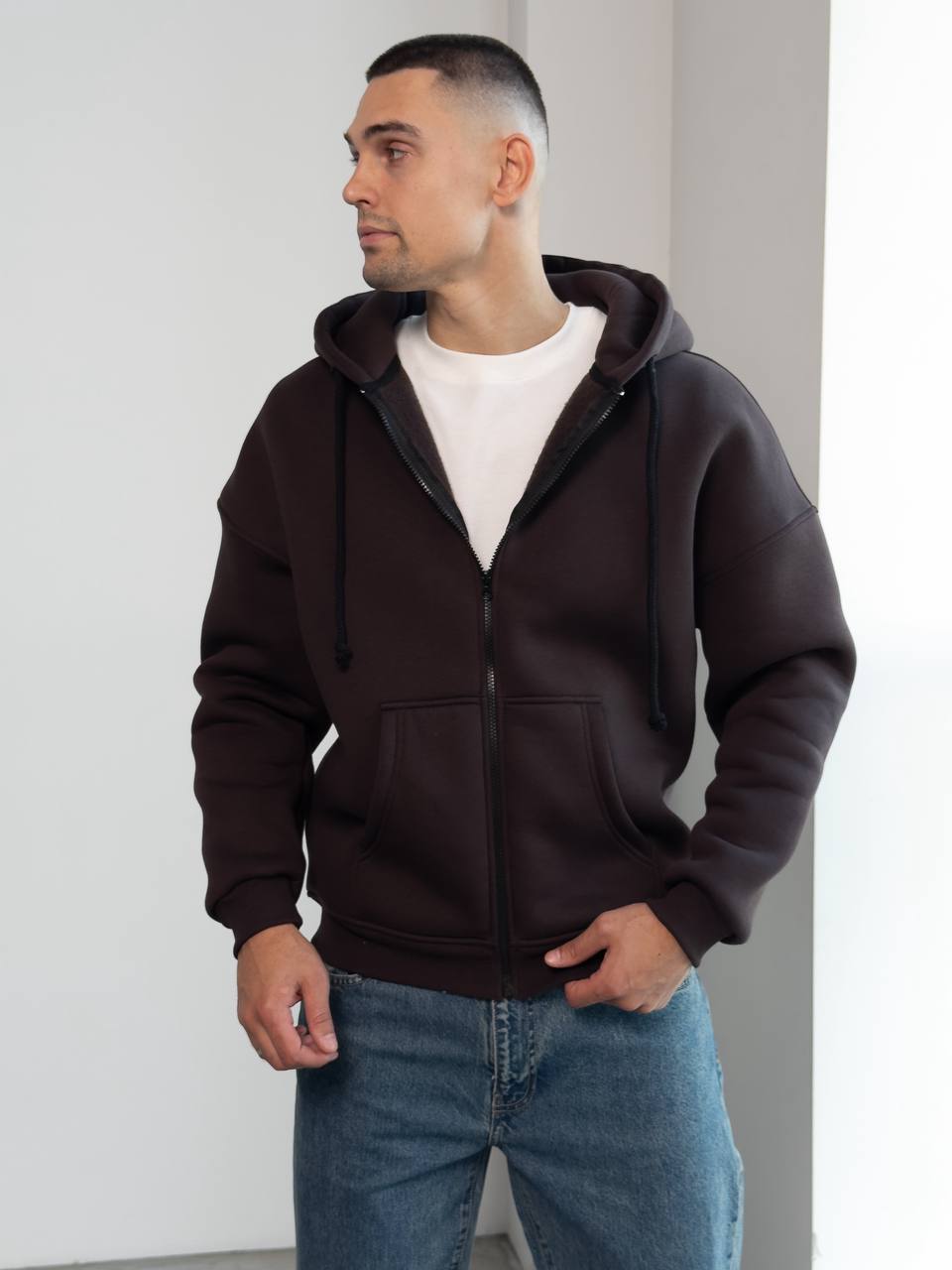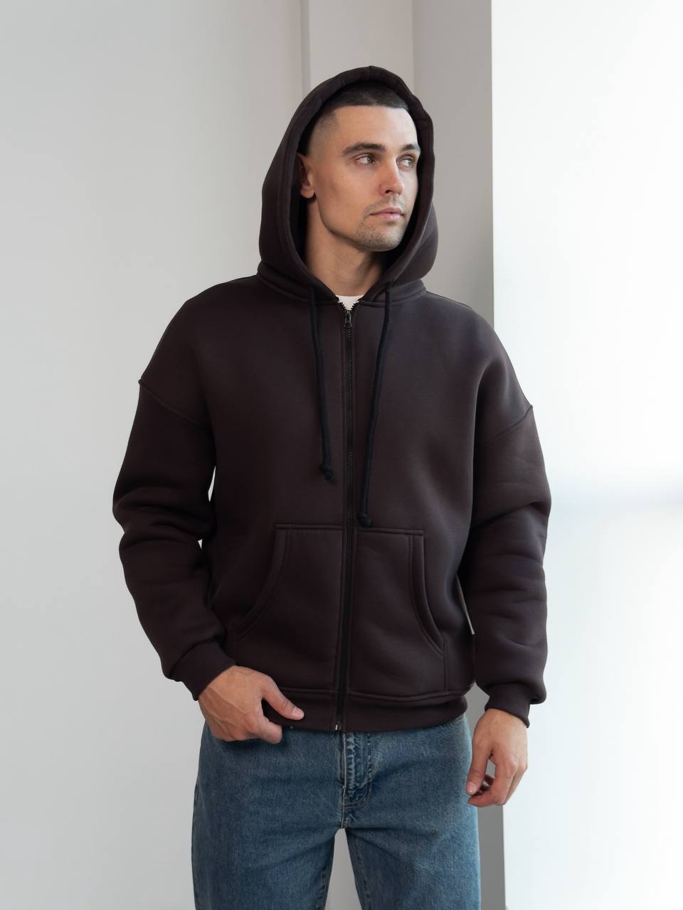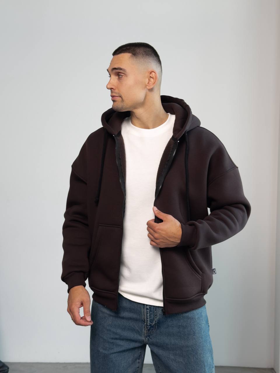 Мужская Теплая Коричневая Кофта Зипка на Флисе – Худи Свободного Кроя на Молнии