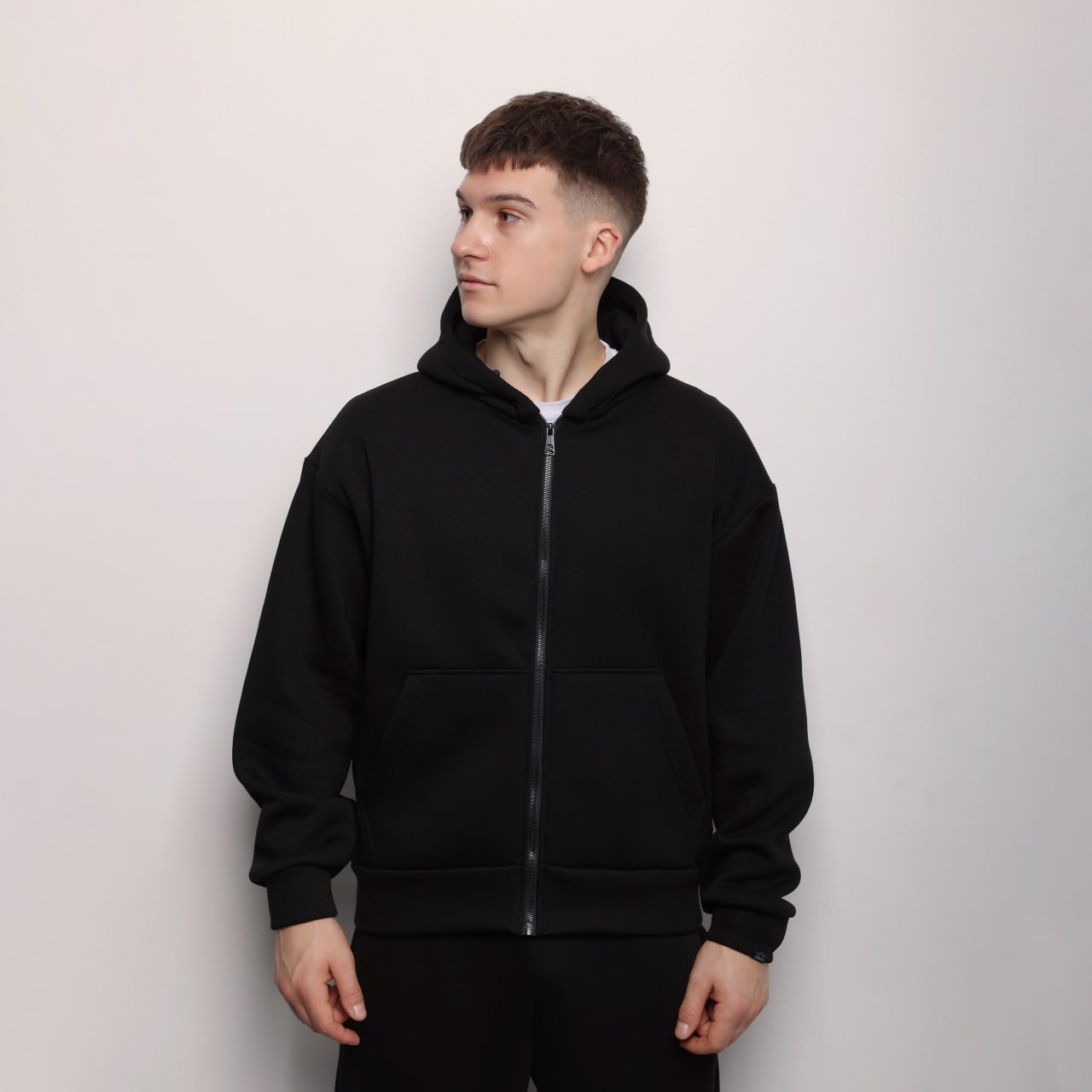 Мужская Утепленная Черная Кофта на Молнии с Капюшоном – Базовое Зип Худи на Флисе