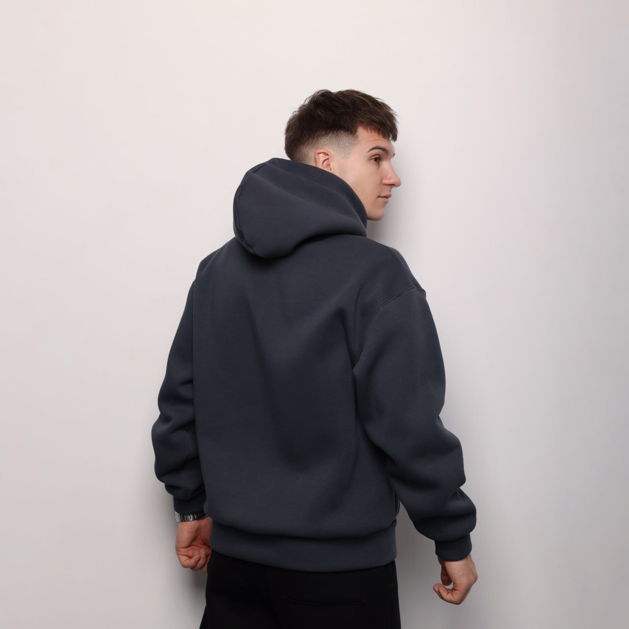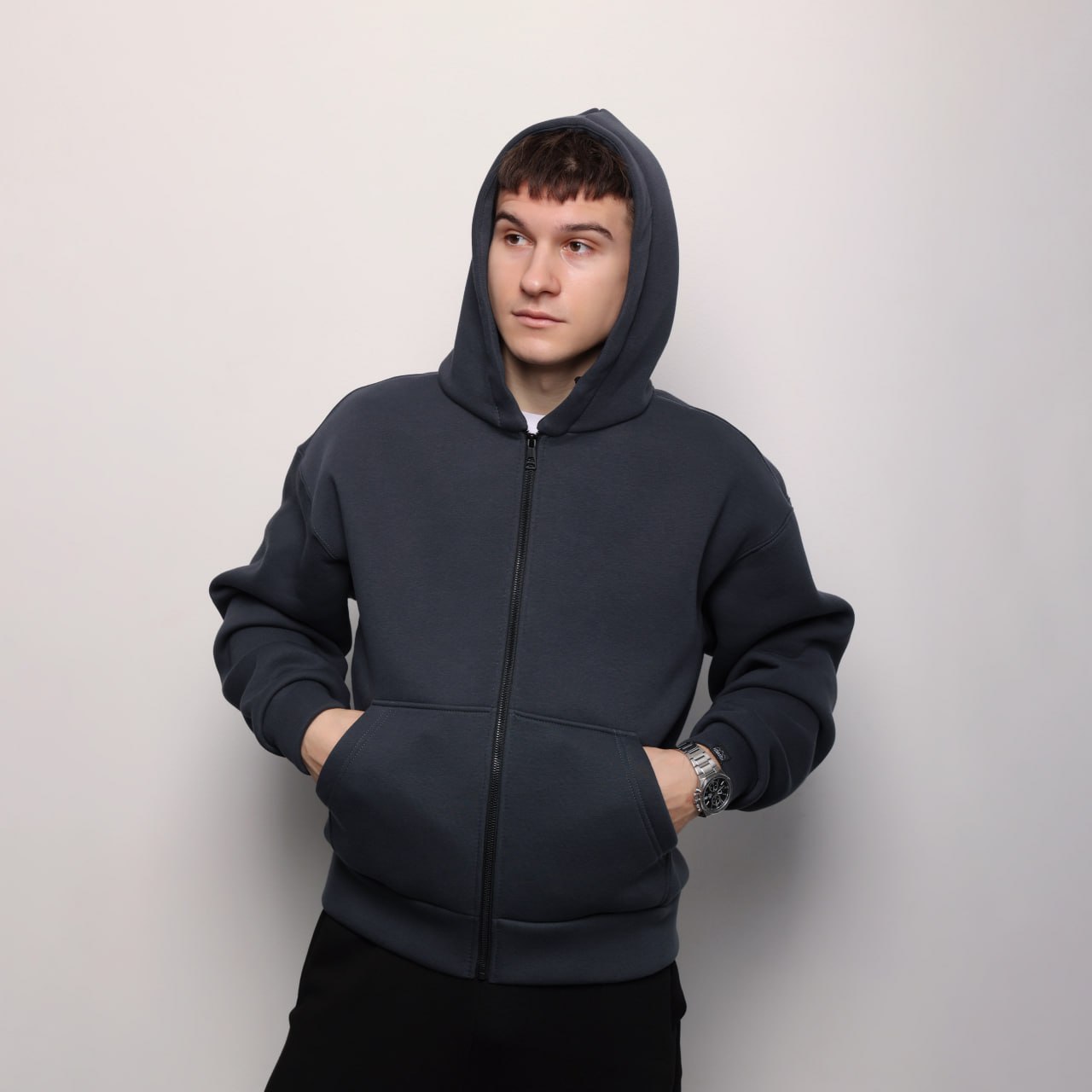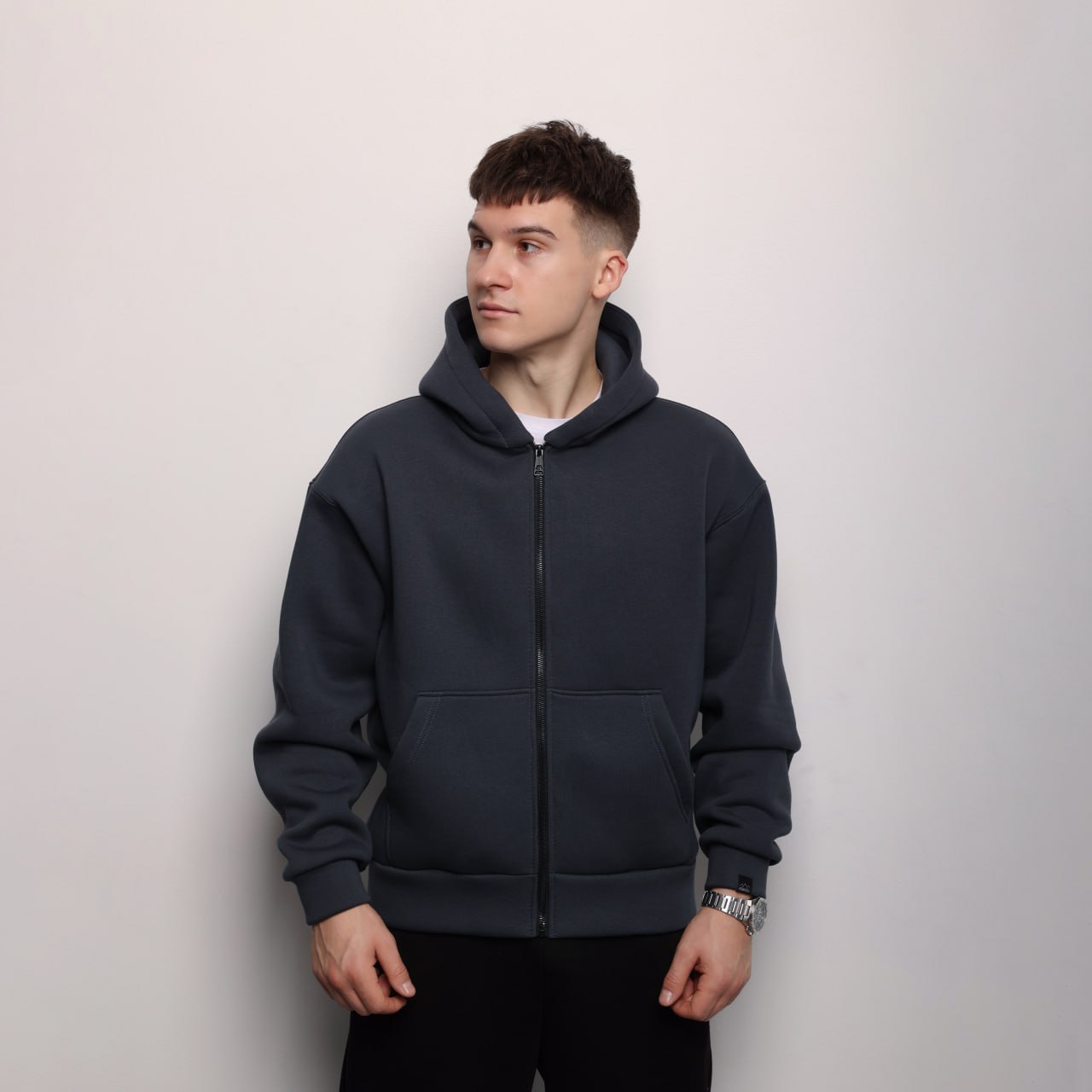 Мужская Утепленная Графитовая Кофта на Молнии с Капюшоном – Базовое Зип Худи на Флисе