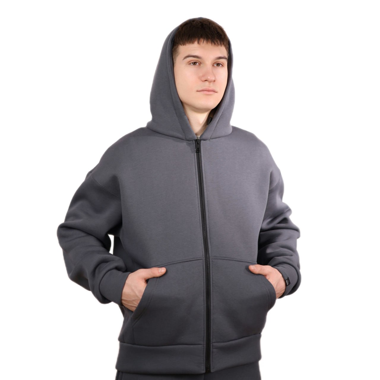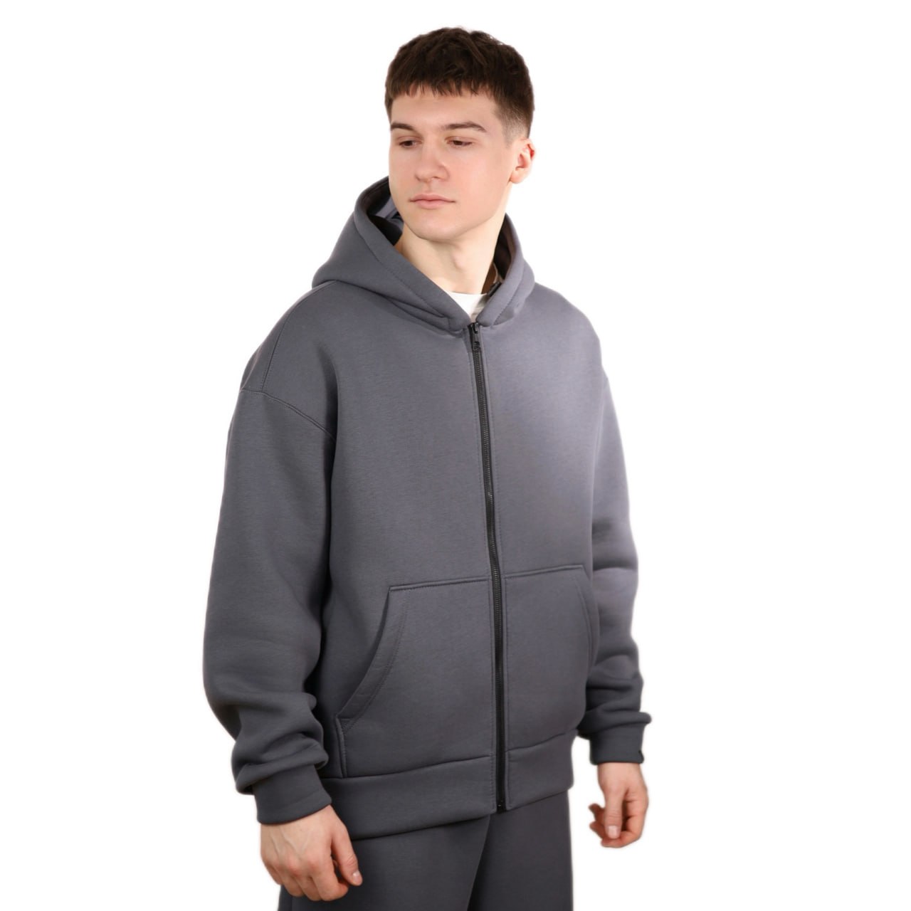 Мужская Утепленная Темно-Серая Кофта на Молнии с Капюшоном – Базовое Зип Худи на Флисе