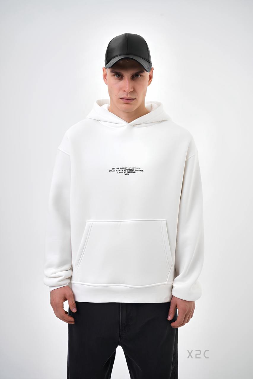 Мужское Базовое Белое Худи Оверсайз с Надписью на Груди