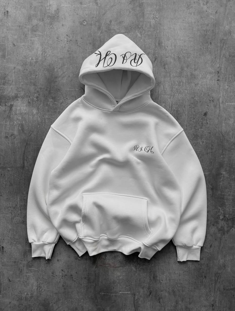 Мужское Базовое Белое Худи Оверсайз с Принтом на Капюшоне – Утепленное на Флисе
