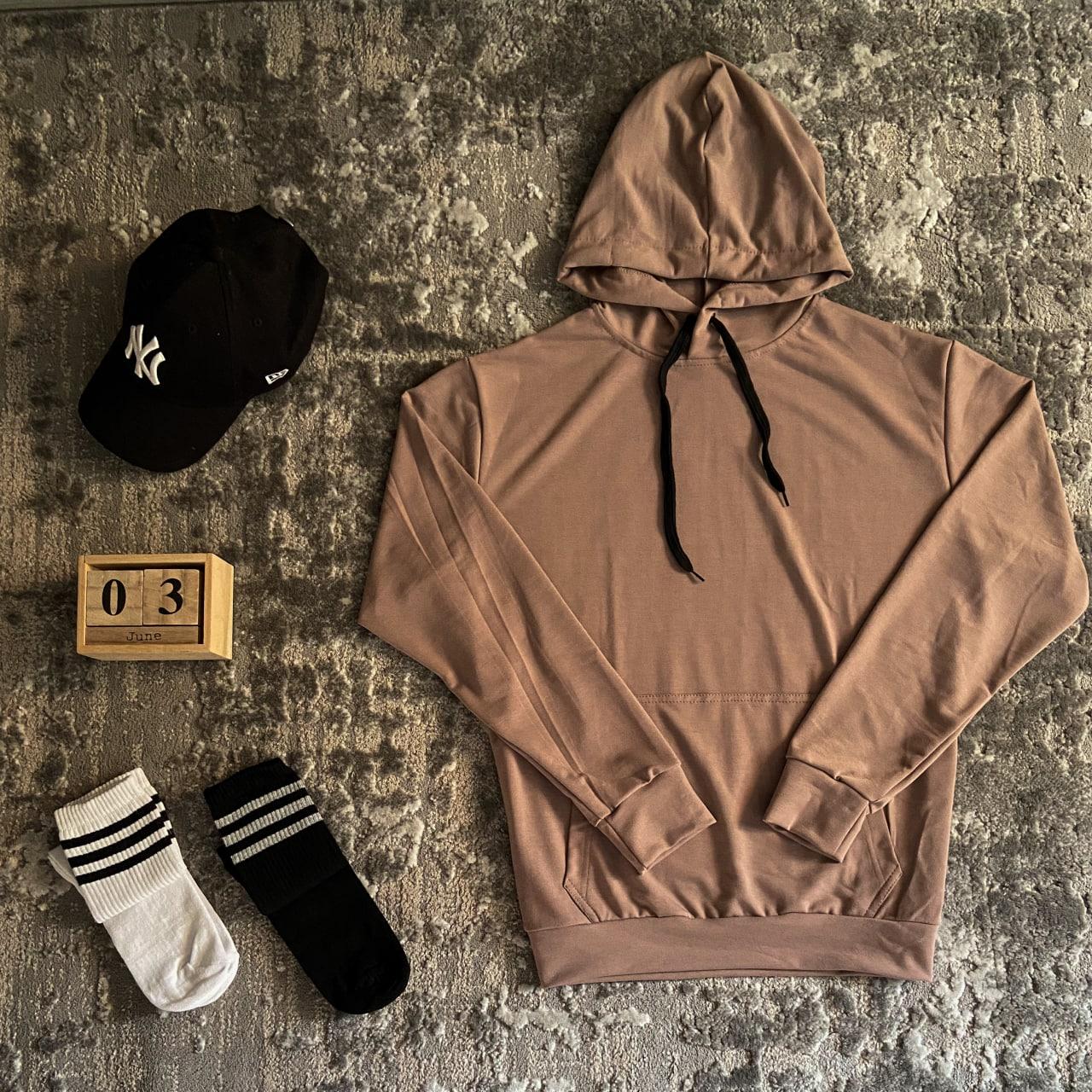 Мужское Базовое Бежевое Худи с Капюшоном и Карманом-Кенгуру