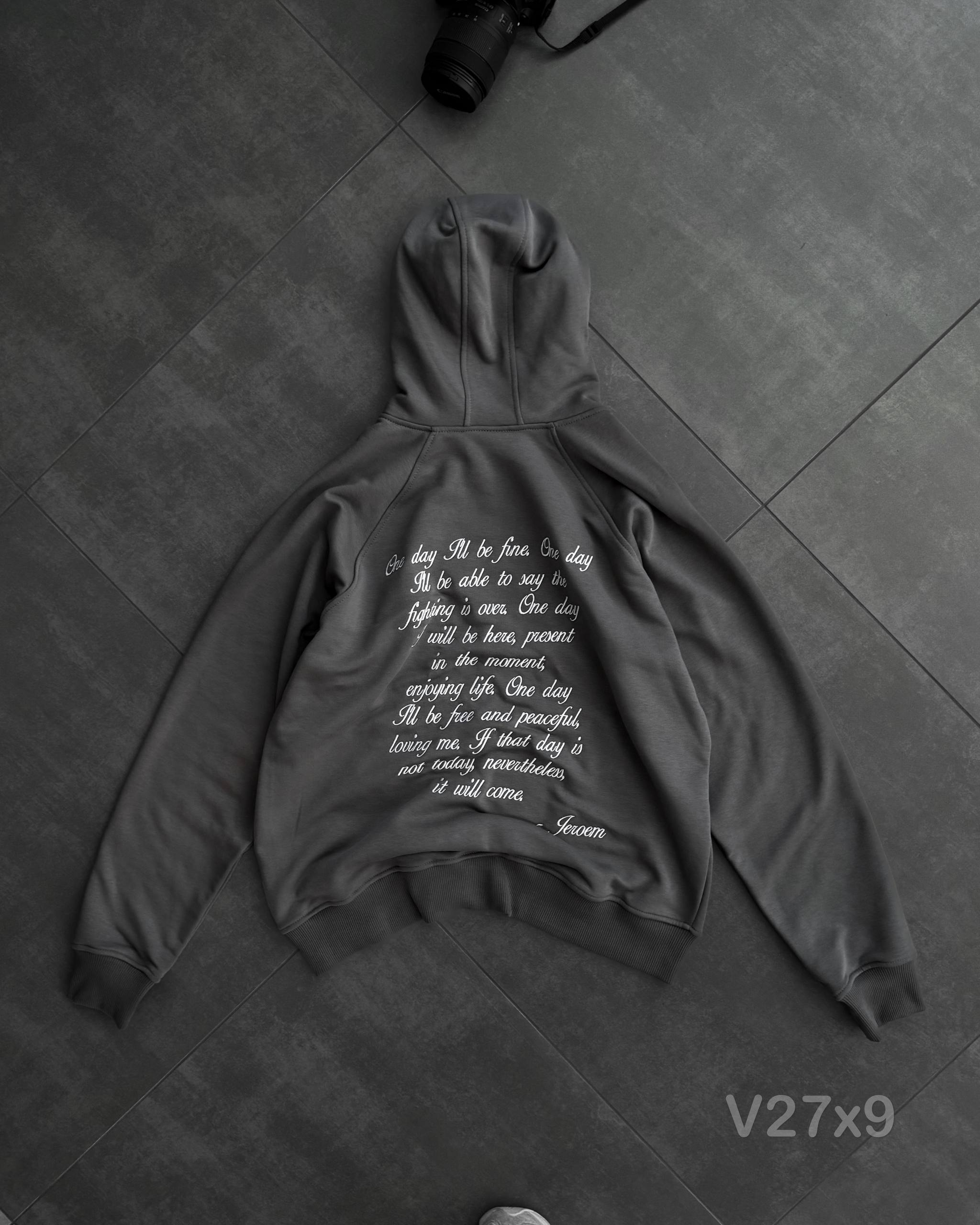 Мужское Базовое Темно-Серое Худи Оверсайз с Вышитой Надписью на Спине – Утепленное с Начесом
