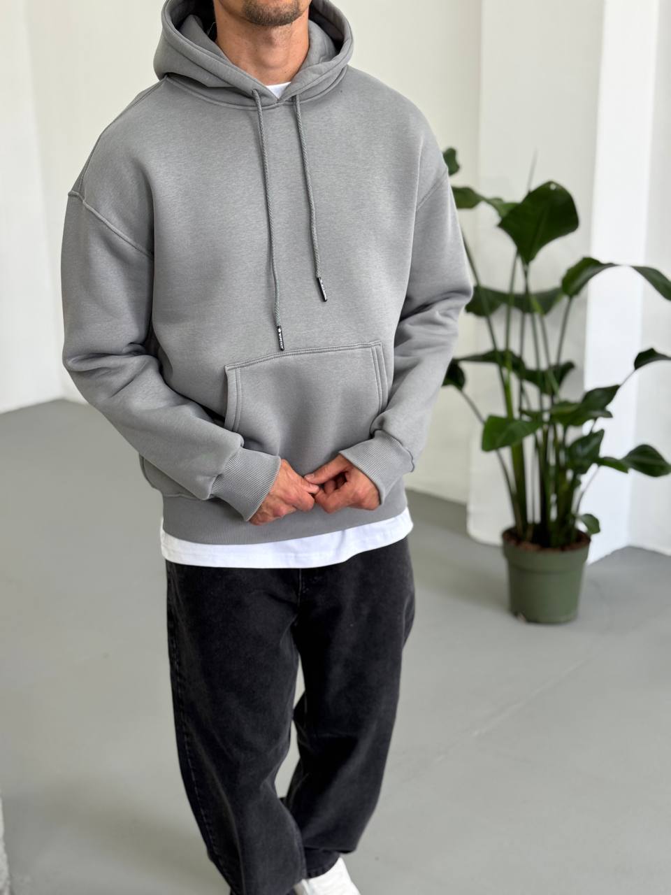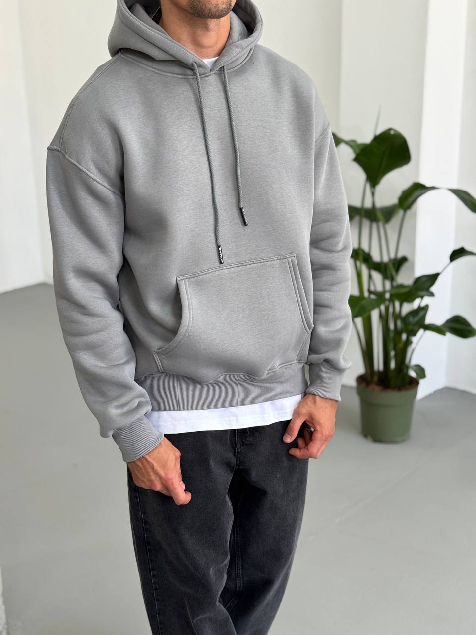 Мужское Базовое Теплое Серое Худи Оверсайз на Флисе