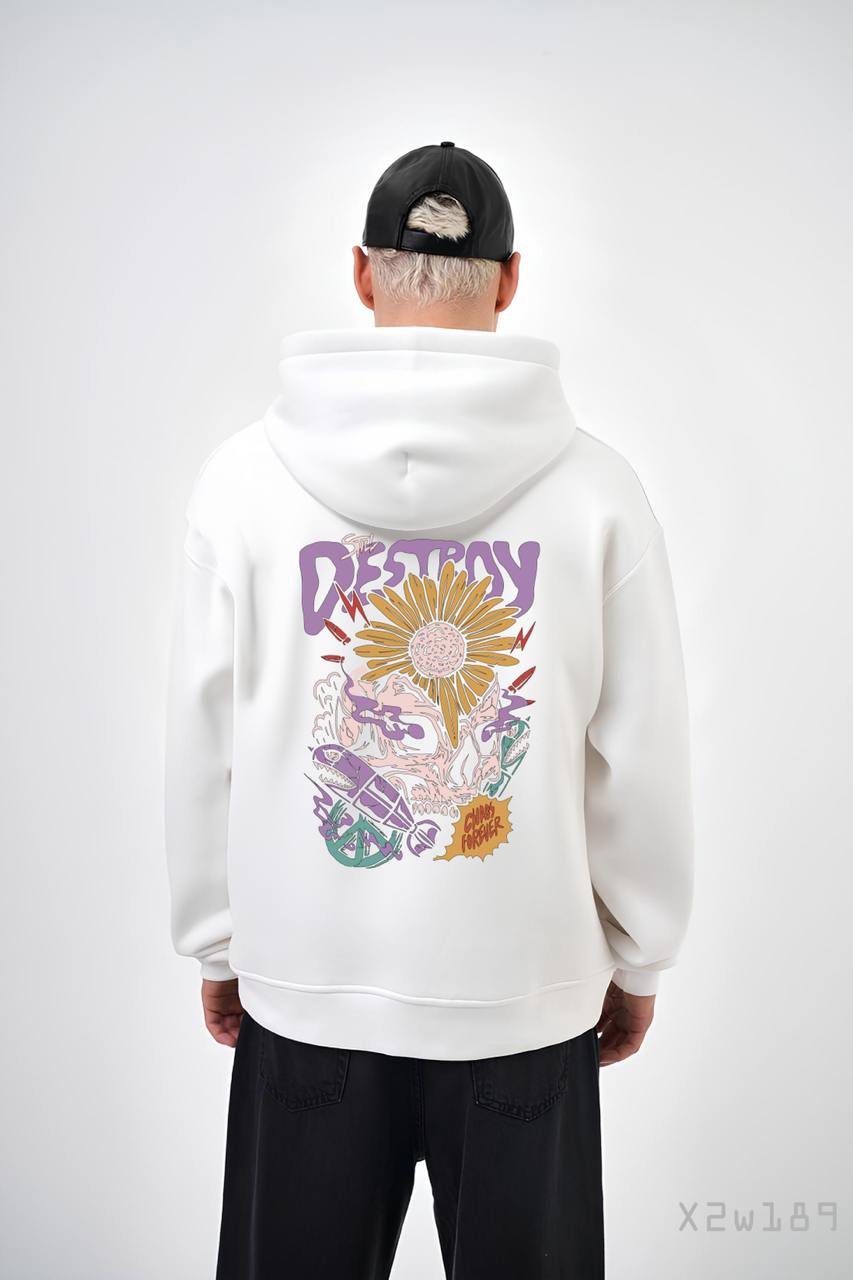 Мужское Белое Худи “Destroy” – Свободного Кроя на Флисе