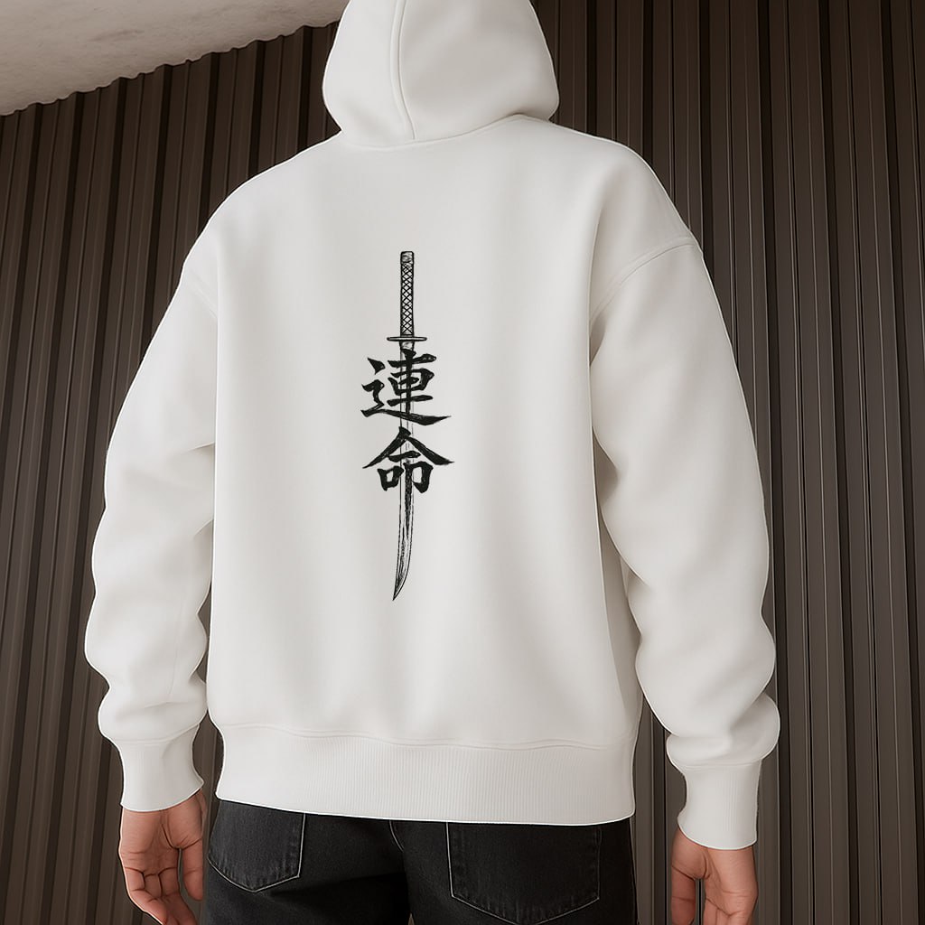 Мужское Белое Худи “NINJA” Оверсайз с Принтом – Утепленное с Начесом