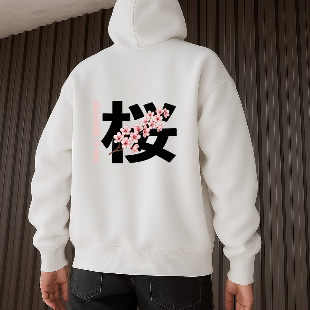 Мужское Белое Худи “SAKURA” Оверсайз с Принтом – Утепленное с Начесом