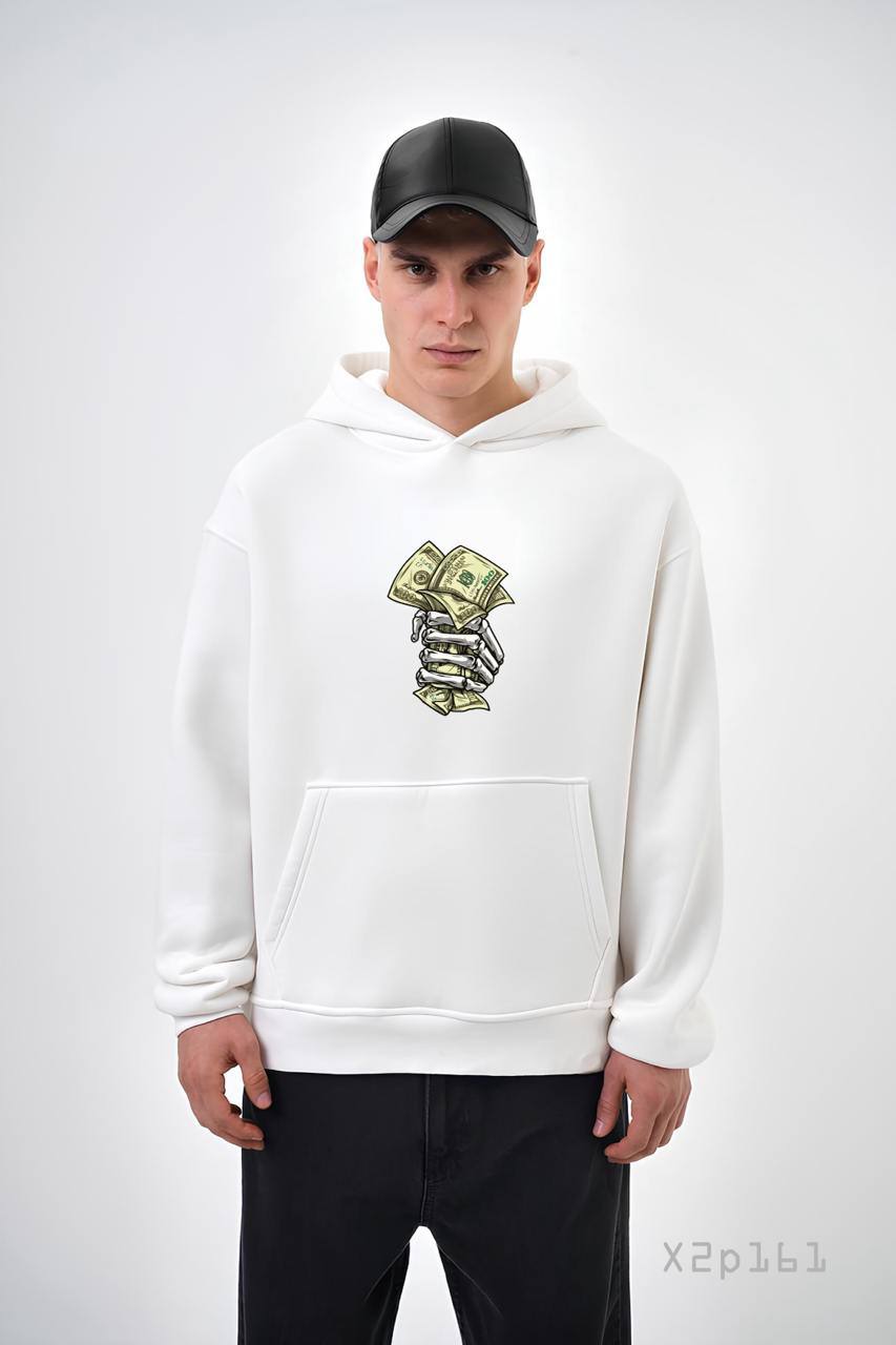 Мужское Белое Худи Свободного Кроя с Принтом Деньги – Трехнитка на Флисе