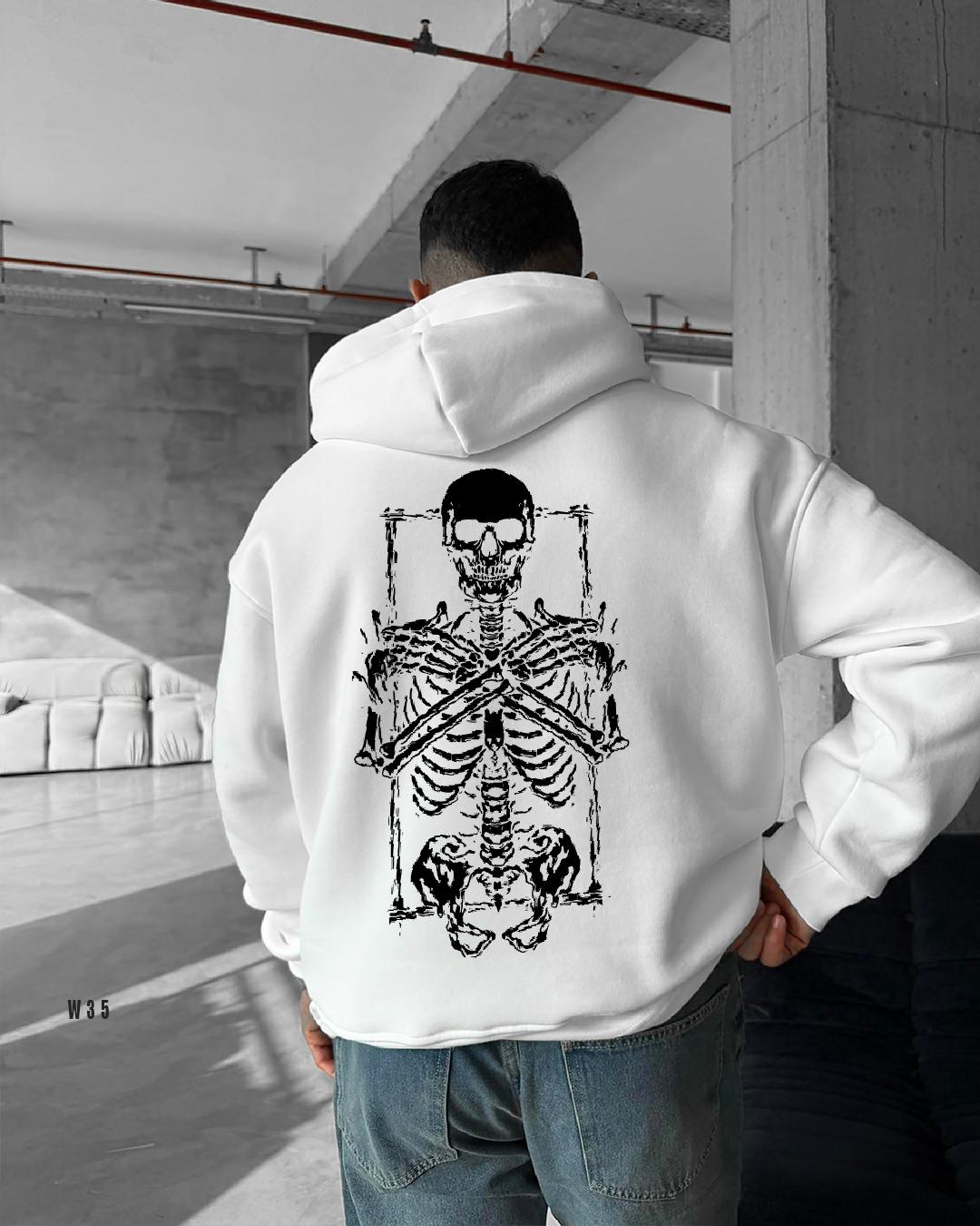 Мужское Белое Худи Свободного Кроя с Принтом Скелет – Трехнитка на Флисе