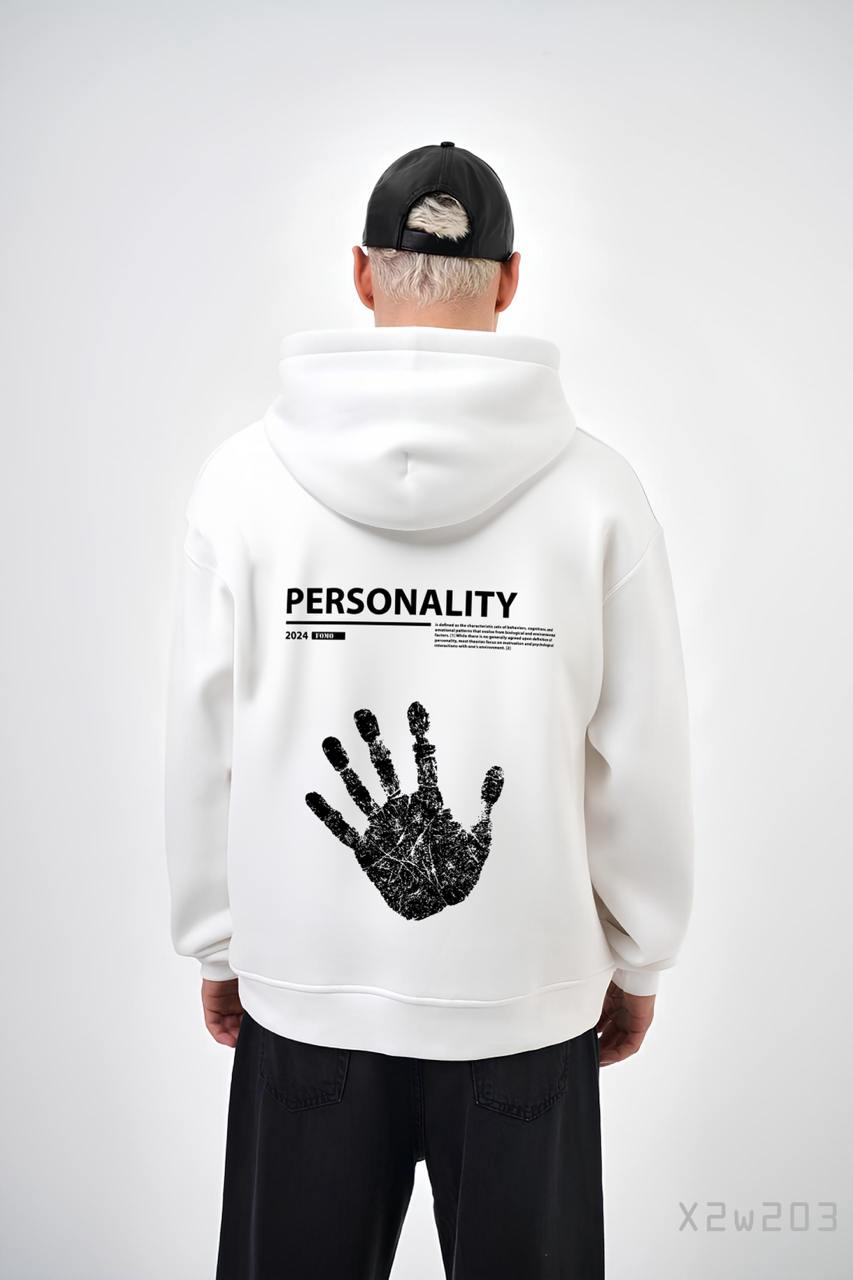 Мужское Белое Худи Свободного Кроя Трехнитка на Флисе с Принтом Рукой