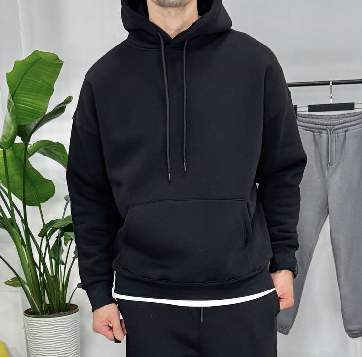 Мужское Черное Худи Оверсайз – Базовое с Утеплением на Флисе