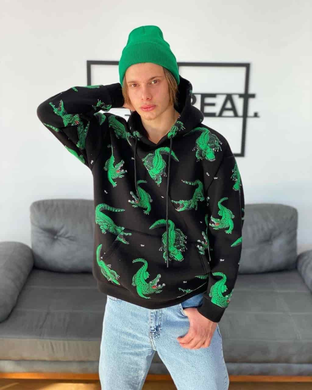 Мужское Черное Худи Оверсайз Crocodile – Свободная Толстовка с Капюшоном и принтом Крокодил