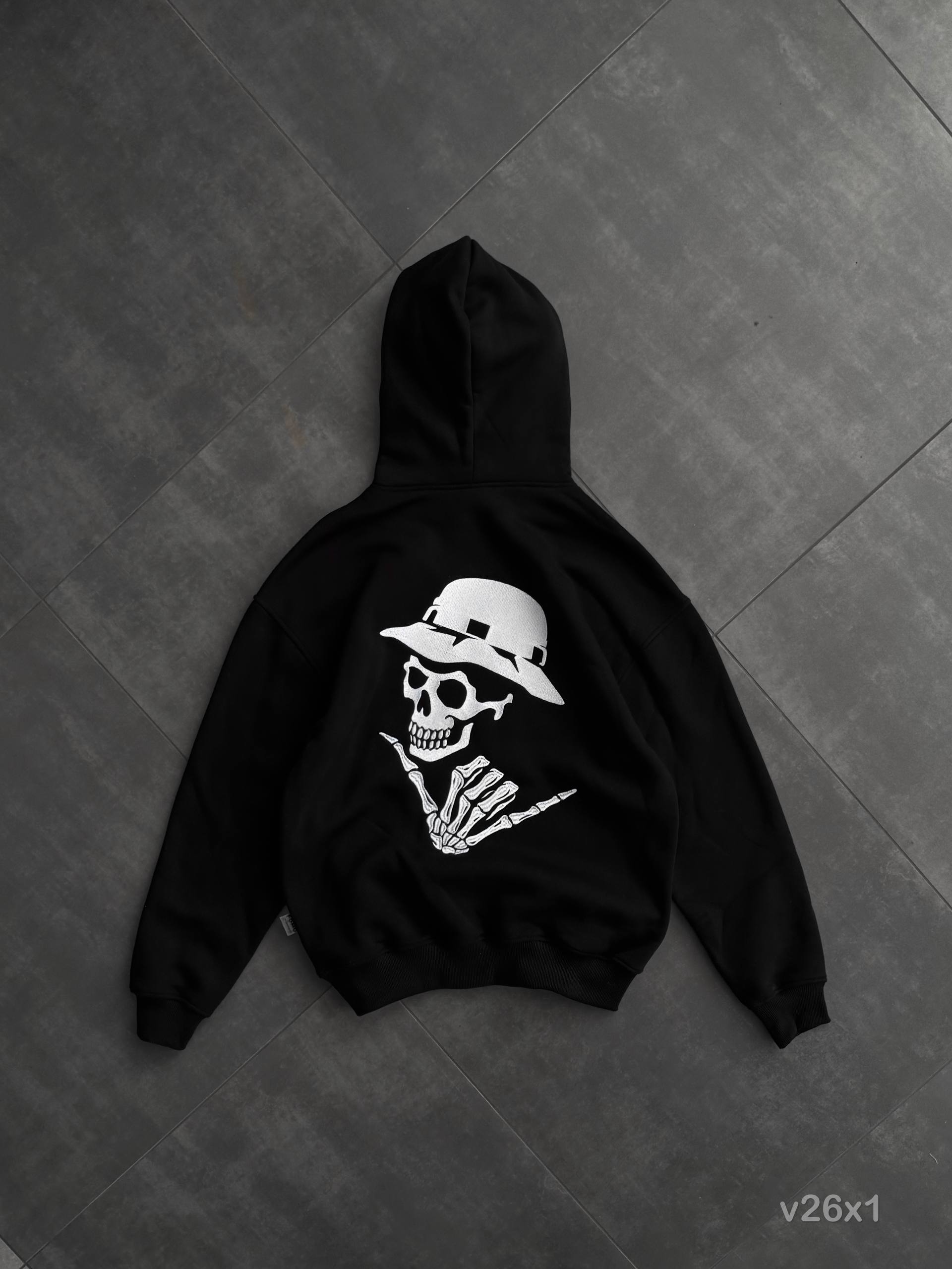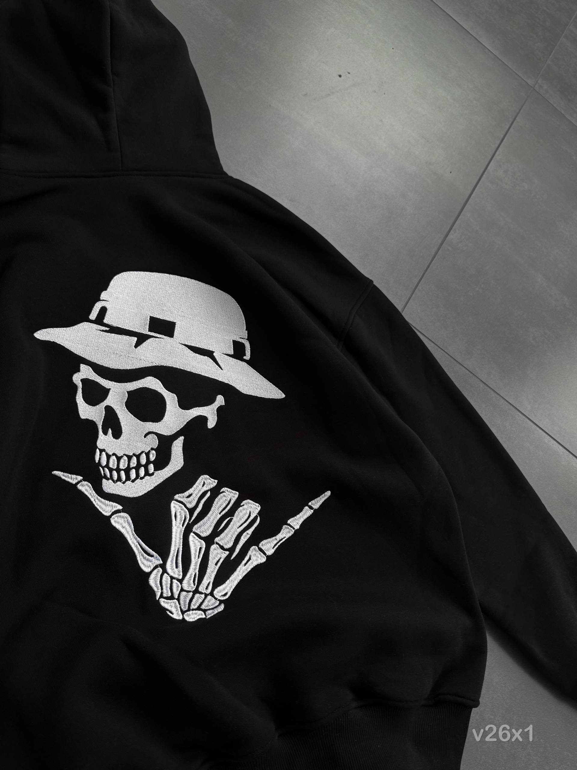 Мужское Черное Худи Оверсайз с Вышивкой Скелет (На Флисе)
