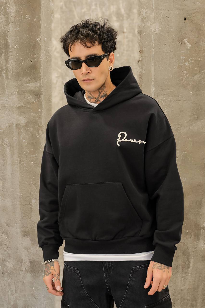 Мужское Черное Худи Paris Оверсаз с Принтом на Спине