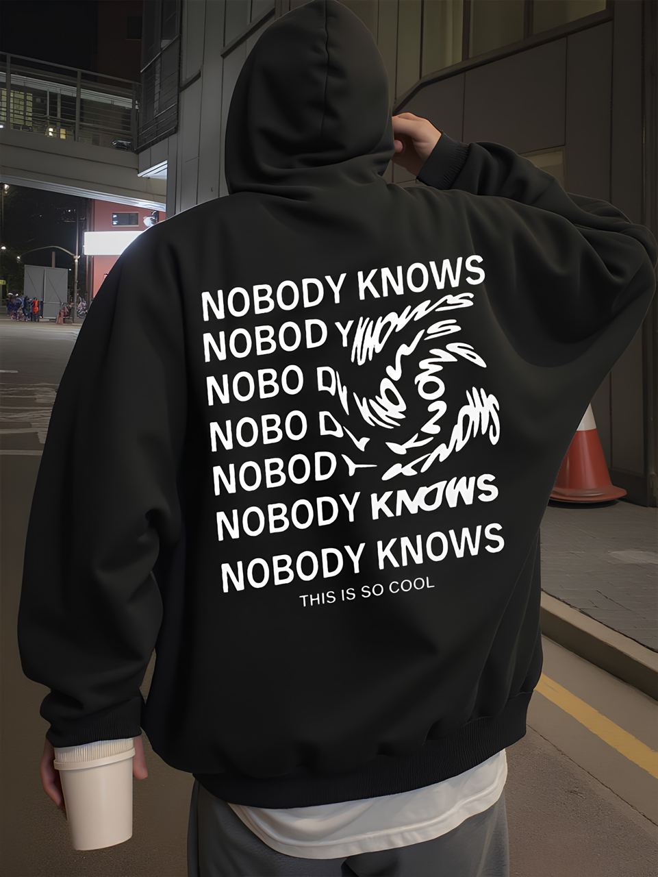Мужское Черное Худи Свободного Кроя – Трехнитка c Принтом “Nobody knows”