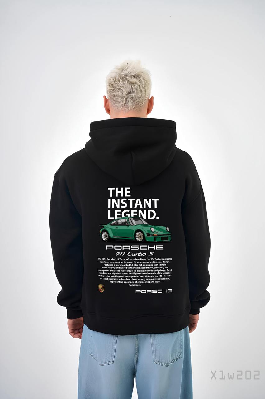Мужское Черное Худи Свободного Кроя Трехнитка на Флисе с Принтом Машина