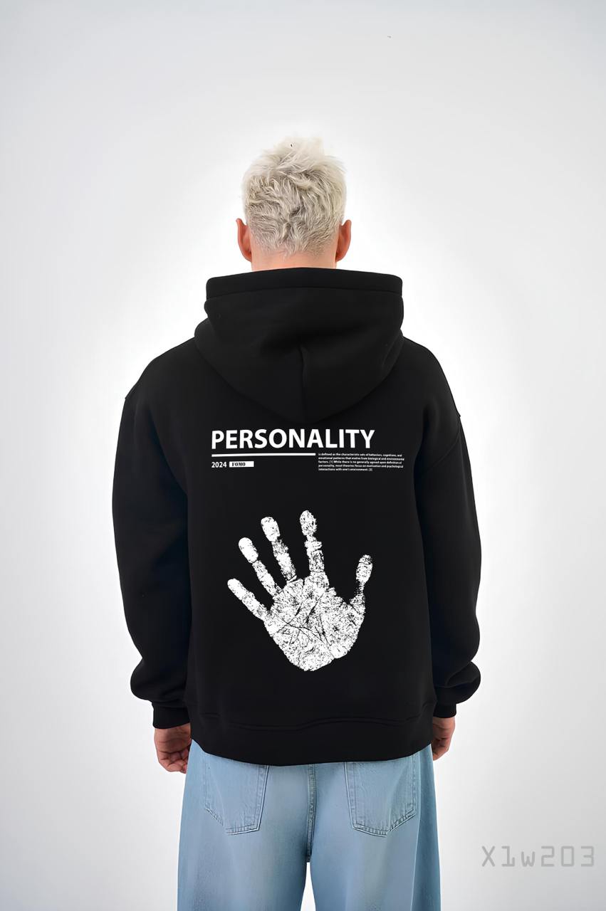 Мужское Черное Худи Свободного Кроя Трехнитка на Флисе с Принтом Рукой