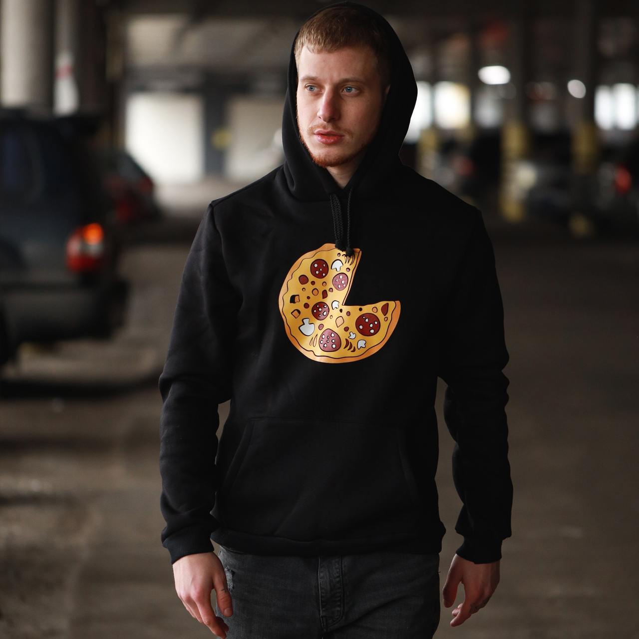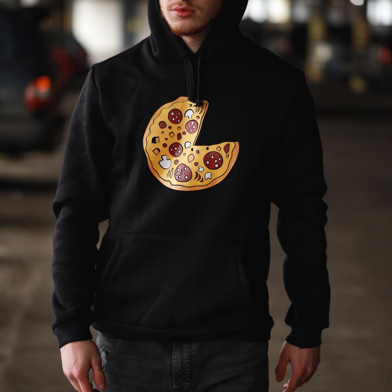 Мужское Черное Худи Трехнитка c Принтом Пицца