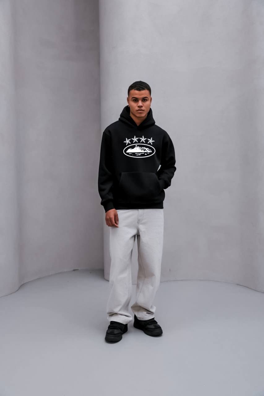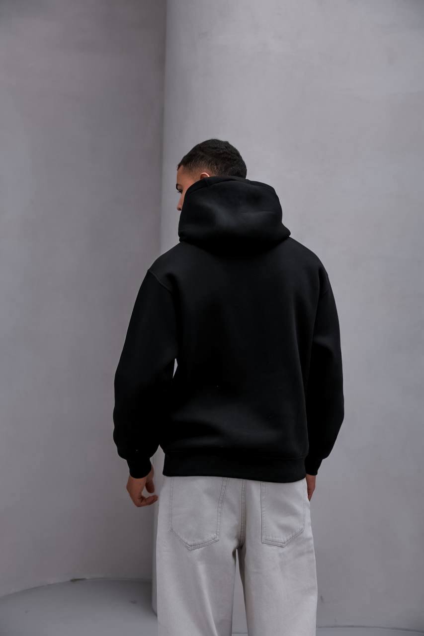Мужское Черное Худи Трехнитка Оверсаз – Толстовка Свободного Кроя с Принтом