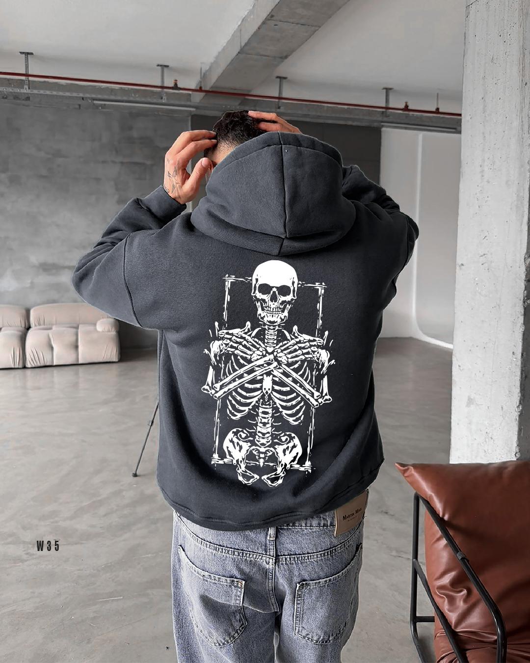 Мужское Графитовое Худи Свободного Кроя с Принтом Скелет – Трехнитка на Флисе