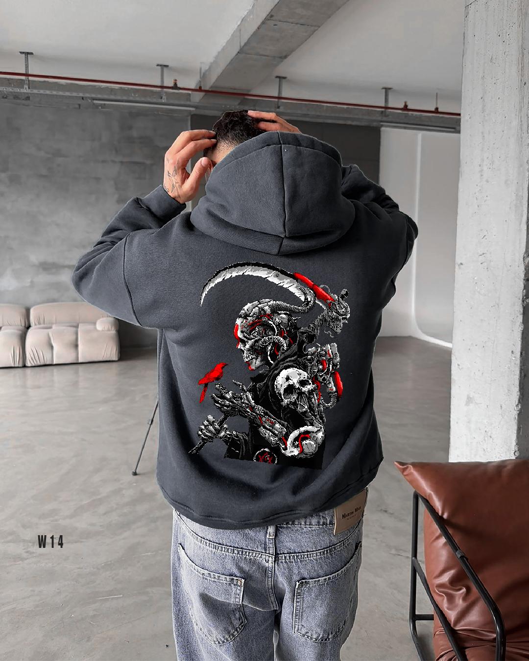 Мужское Графитовое Худи Свободного Кроя с Принтом Смерть с Косой – Трехнитка на Флисе