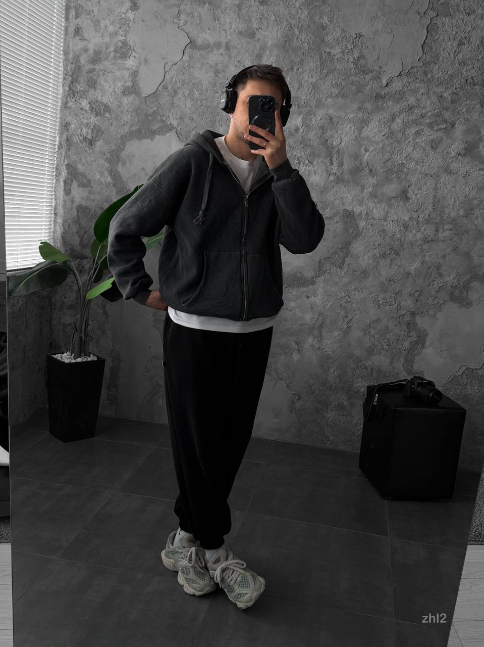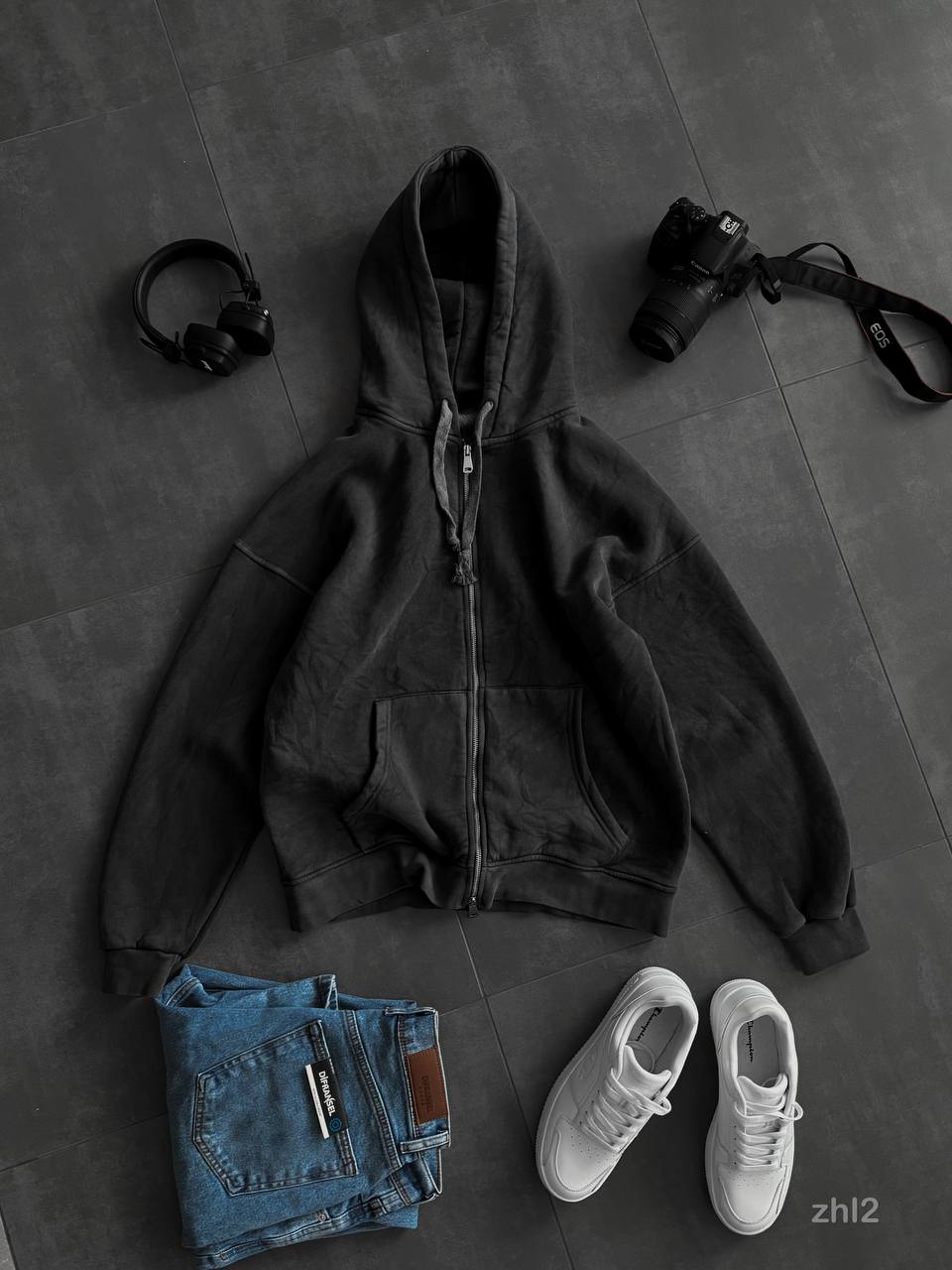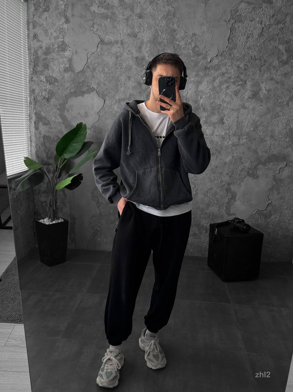 Мужское Графитовое Вареное Худи Зипка Оверсайз на Молнии – Утепленное на Флисе