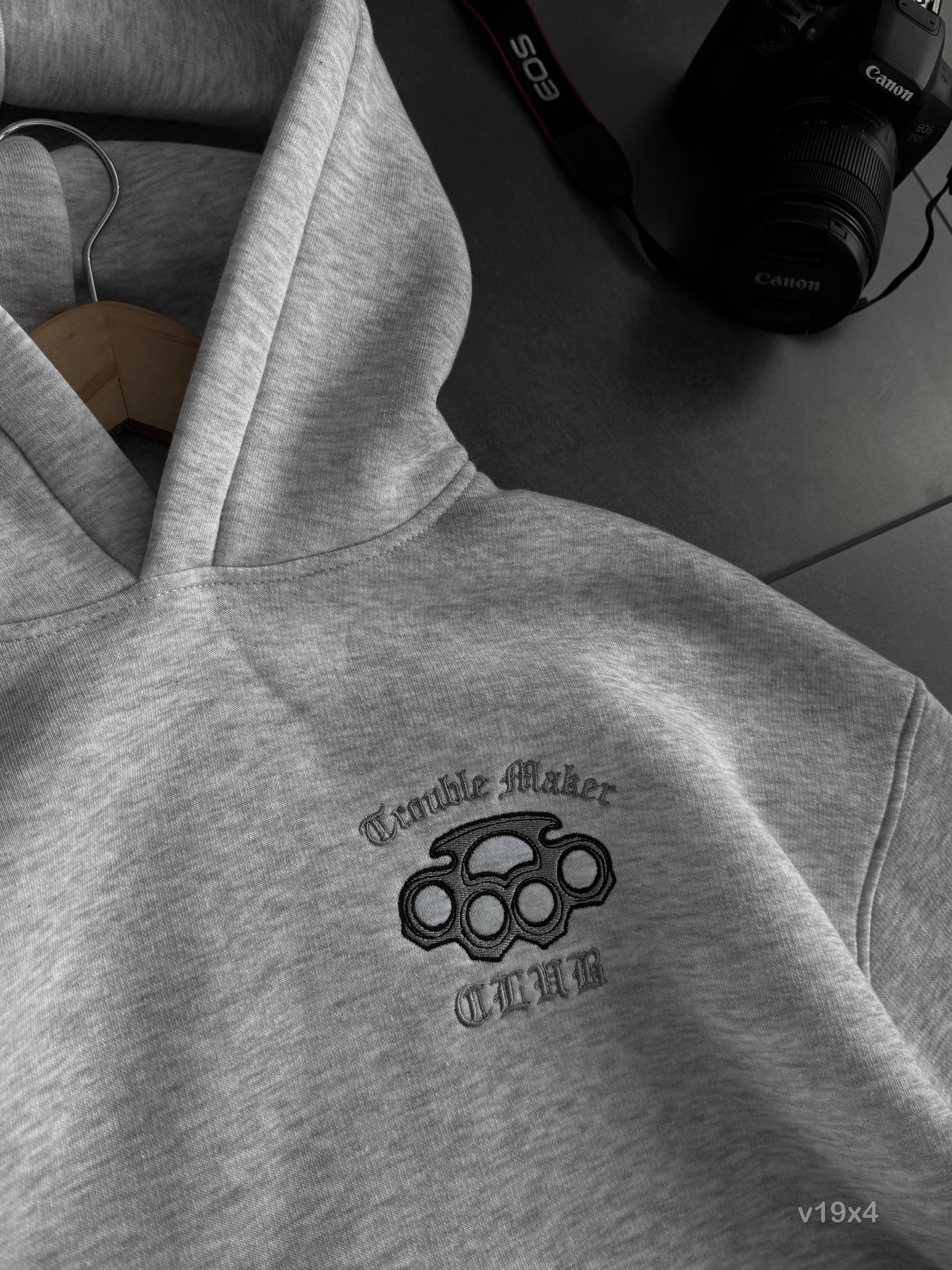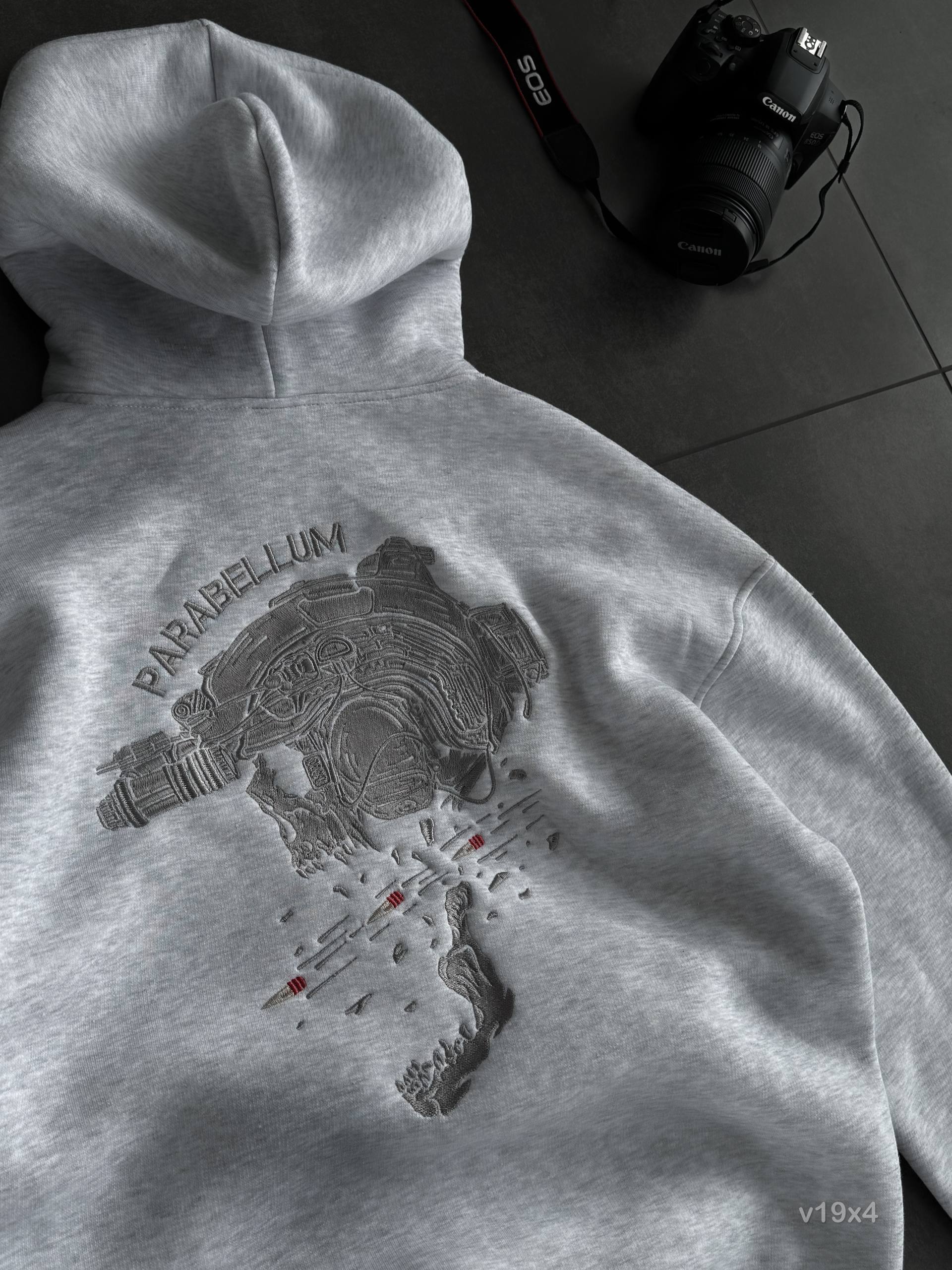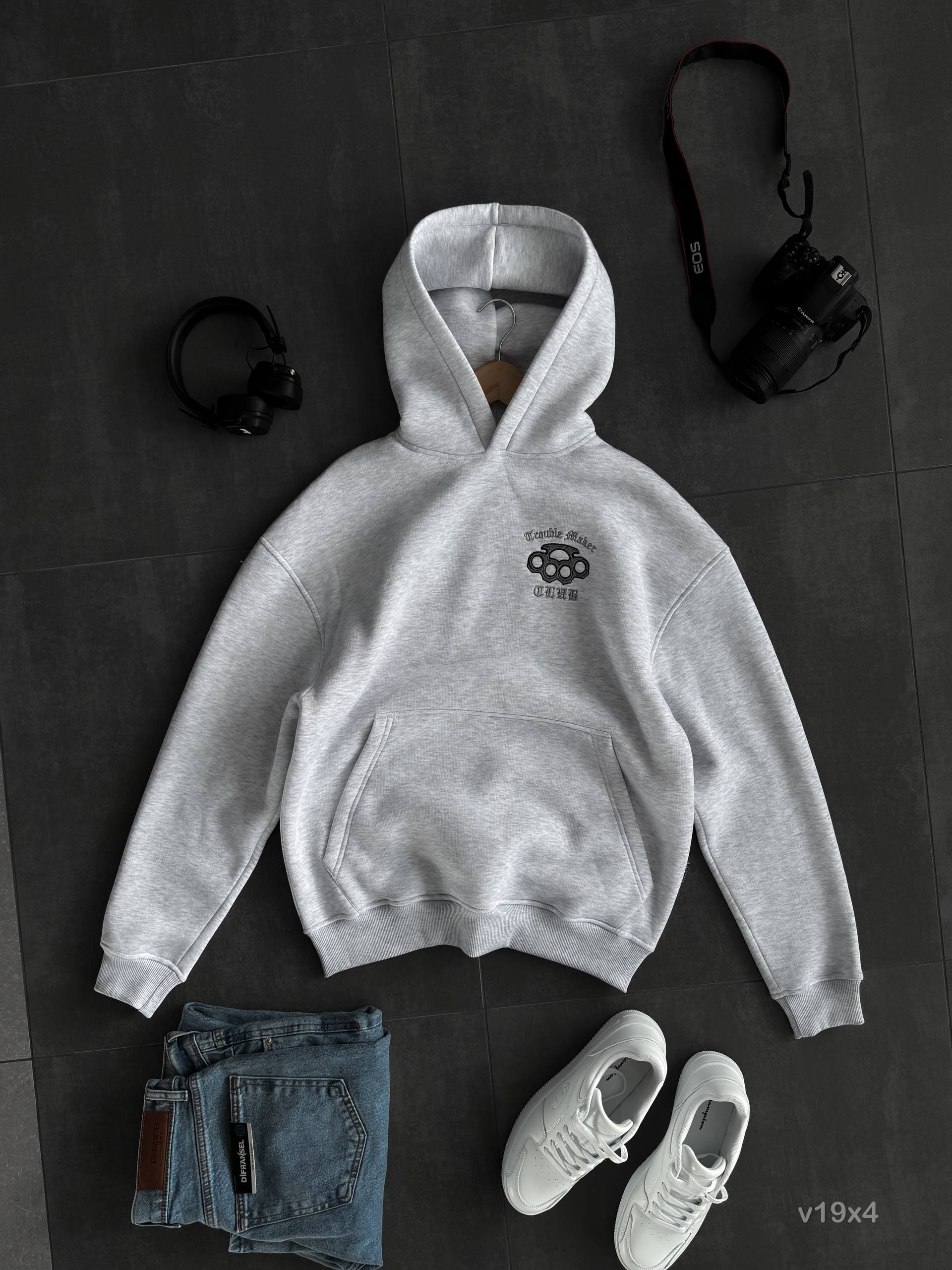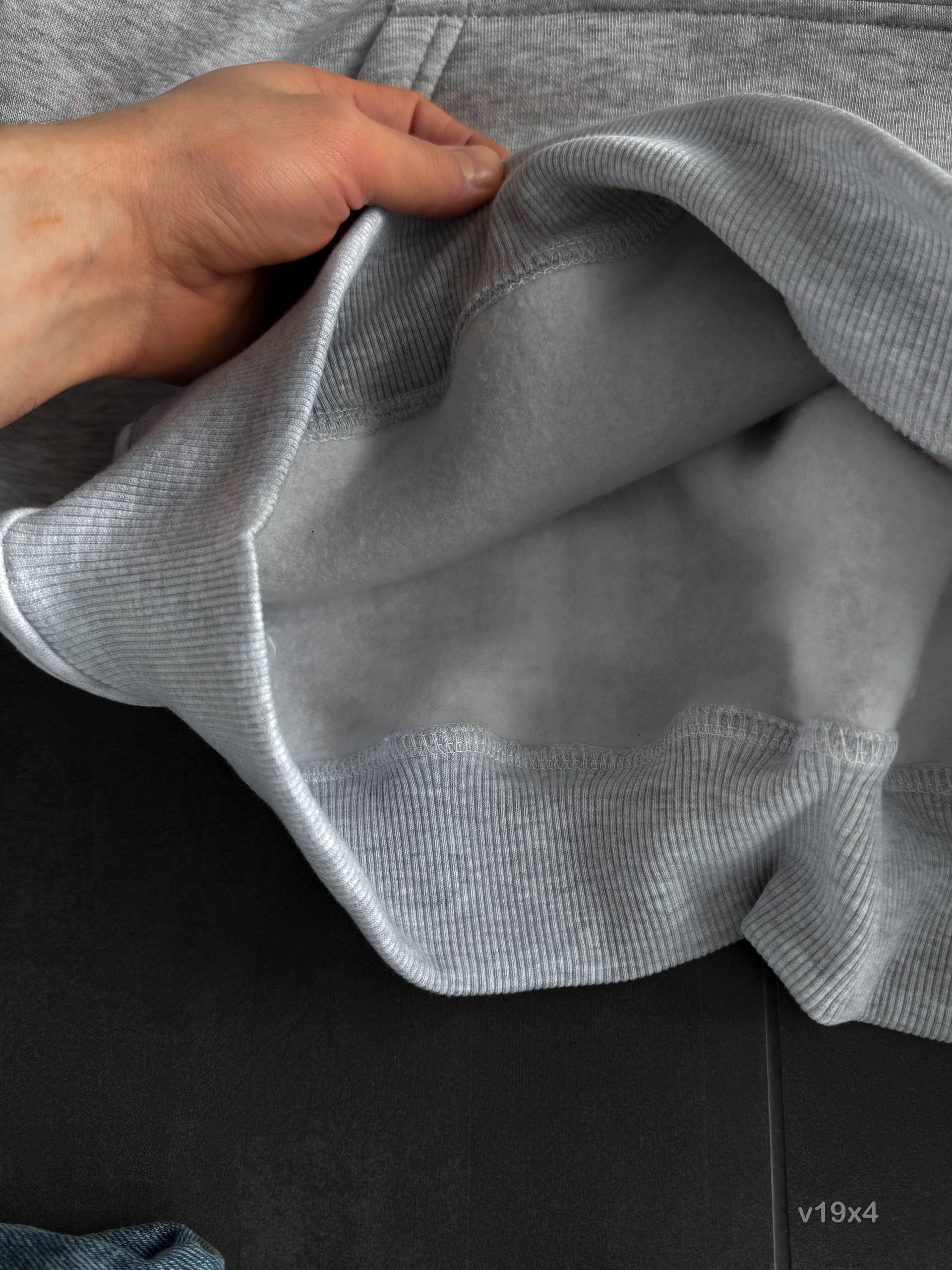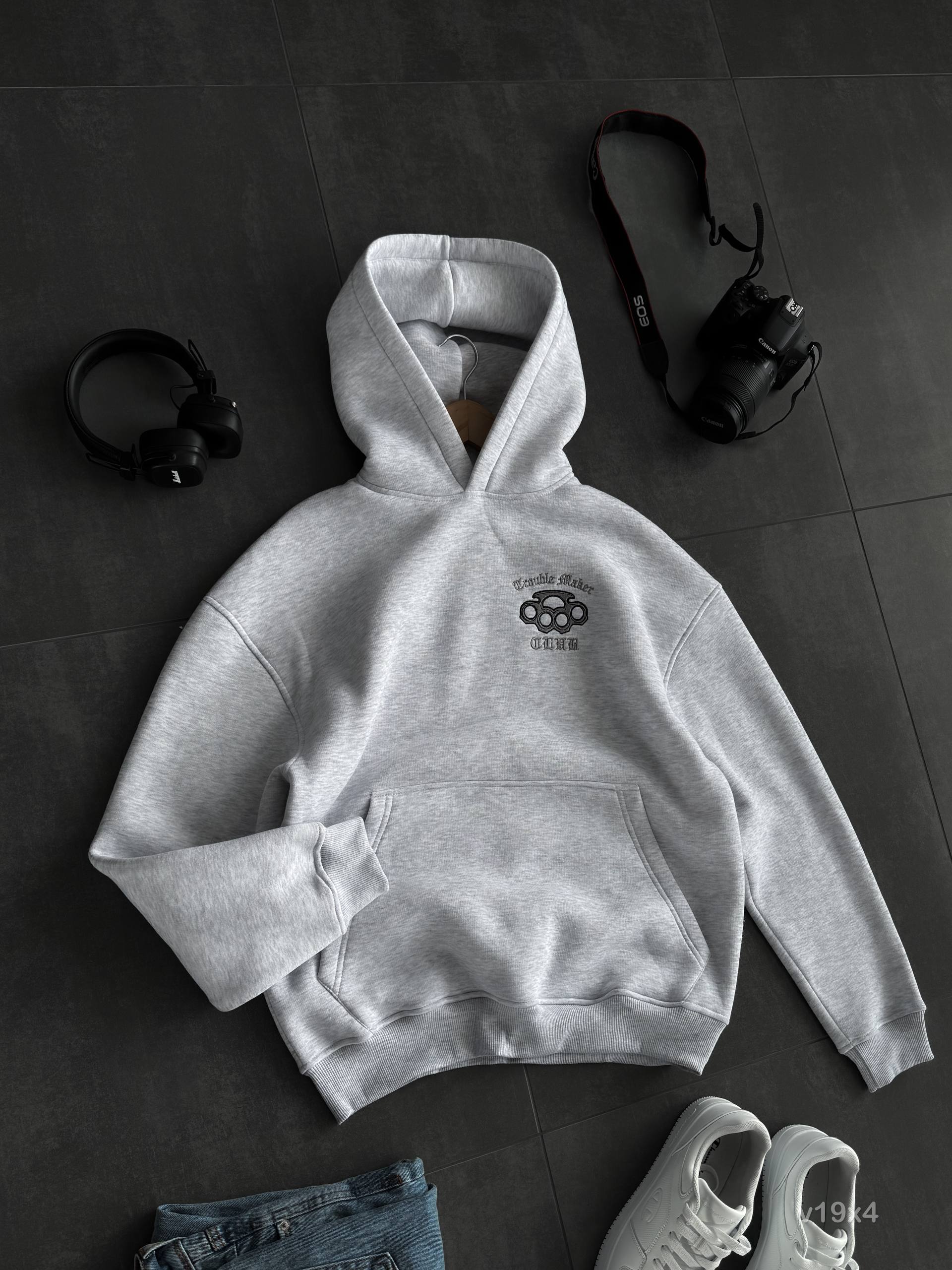 Мужское Худи Серое Меланж Оверсайз с Вышивкой на Спине – Утепленное на Флисе