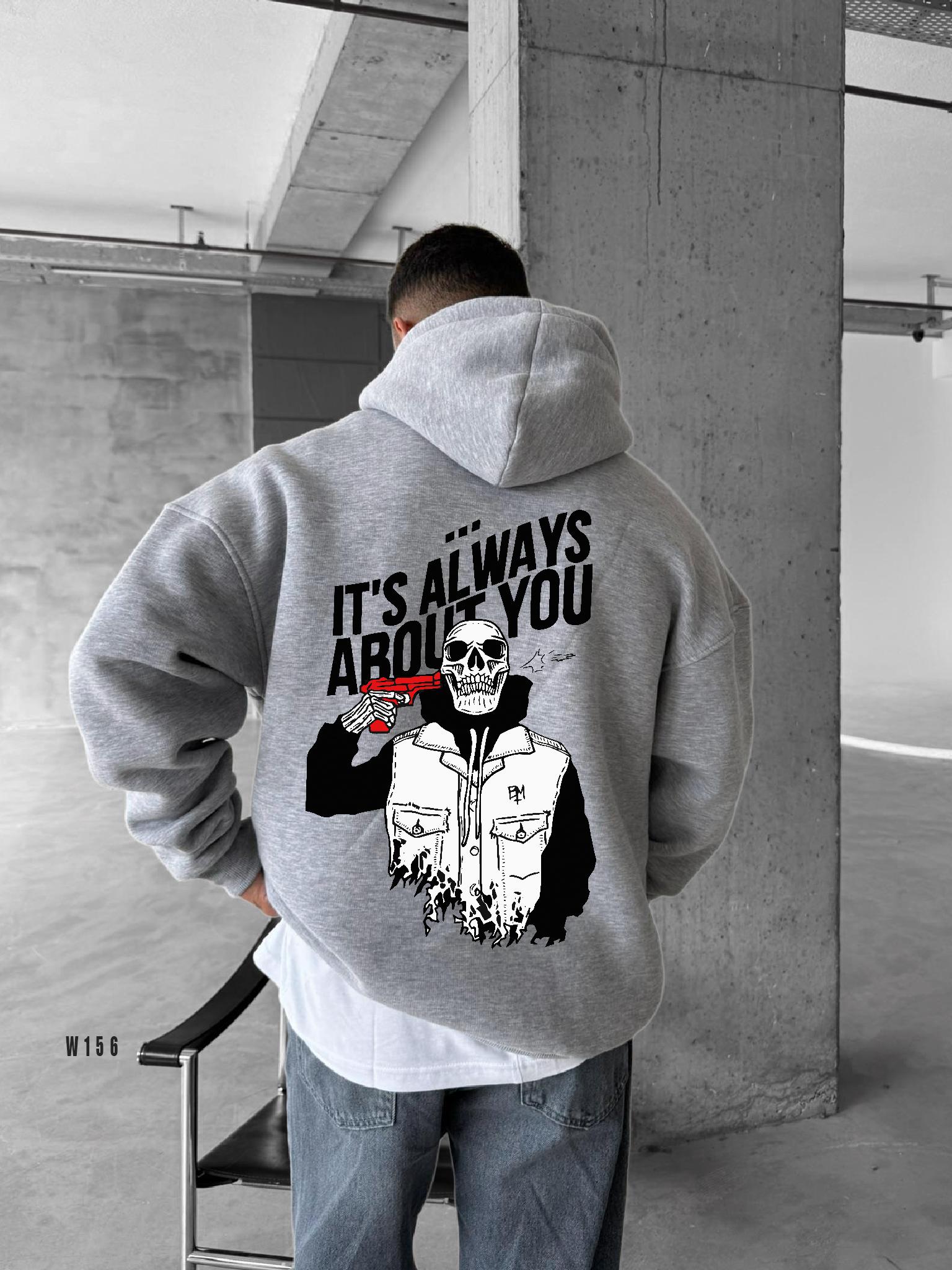 Мужское Худи Серое Меланж Свободного Кроя “It’s Always About You” – Трехнитка на Флисе