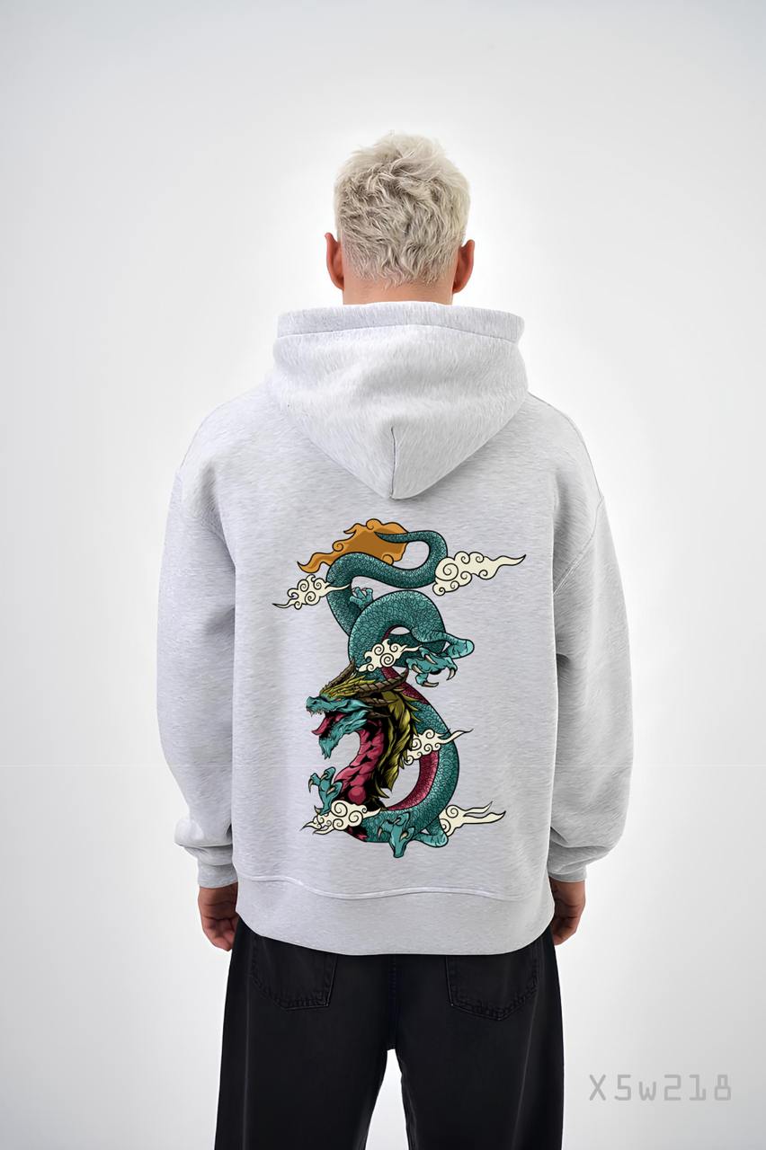 Мужское Худи Серое Меланж Свободного Кроя с Принтом Дракон – Трехнитка на Флисе