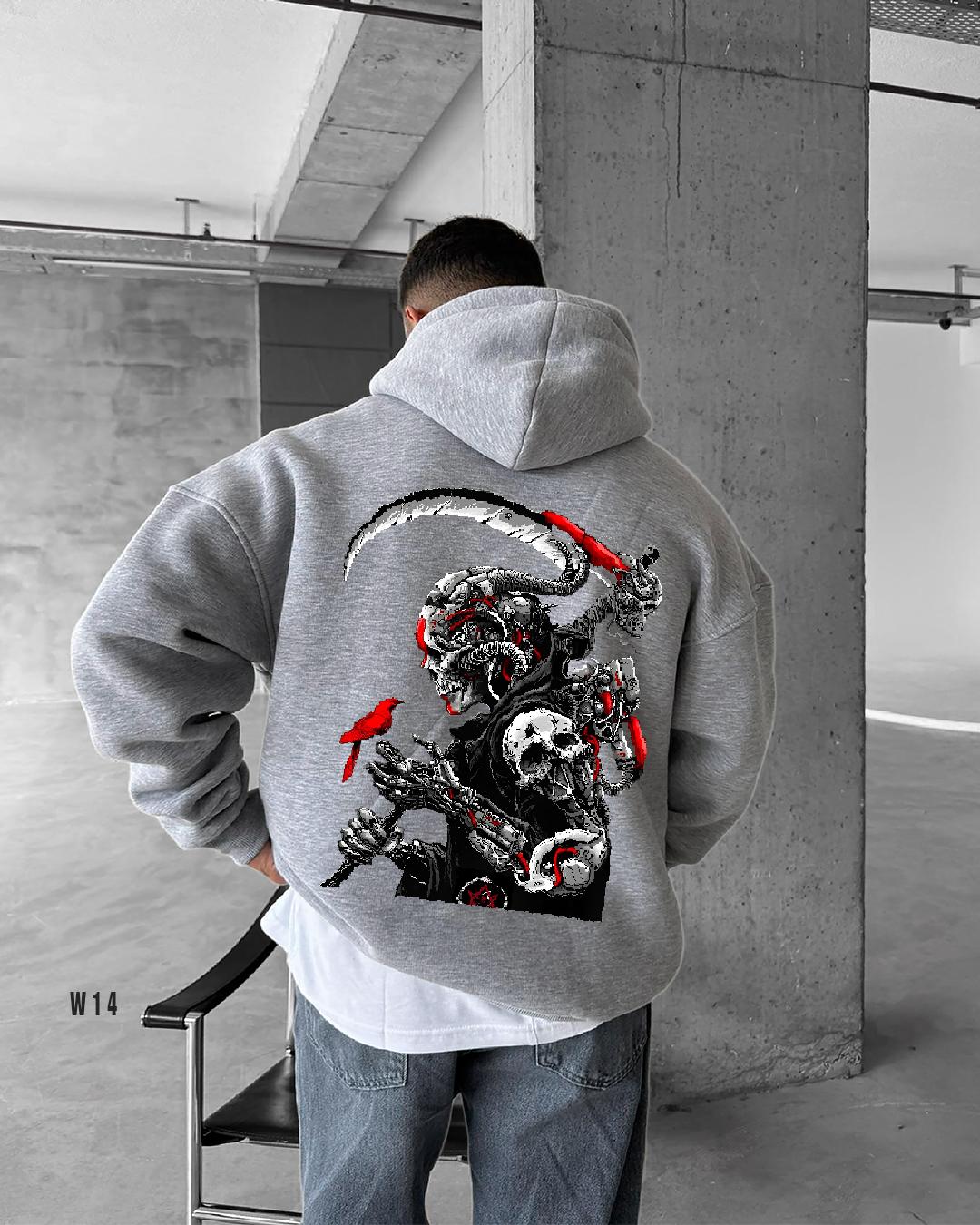 Мужское Худи Серое Меланж Свободного Кроя с Принтом Смерть с Косой – Трехнитка на Флисе