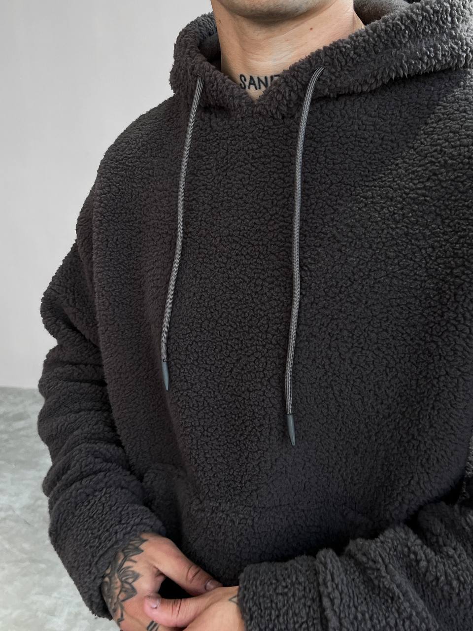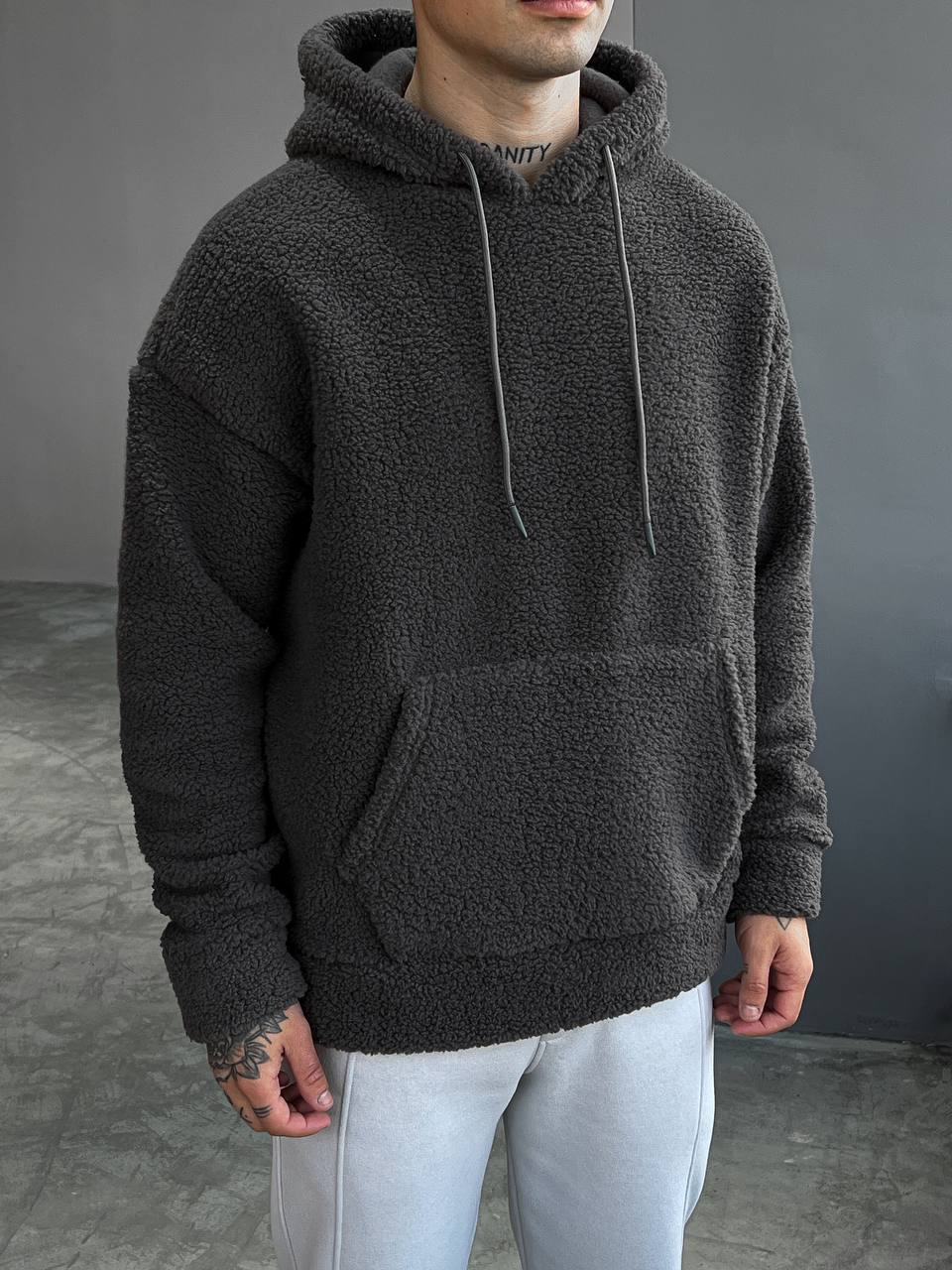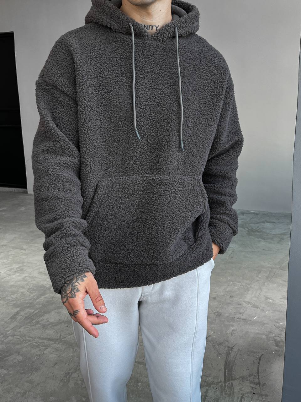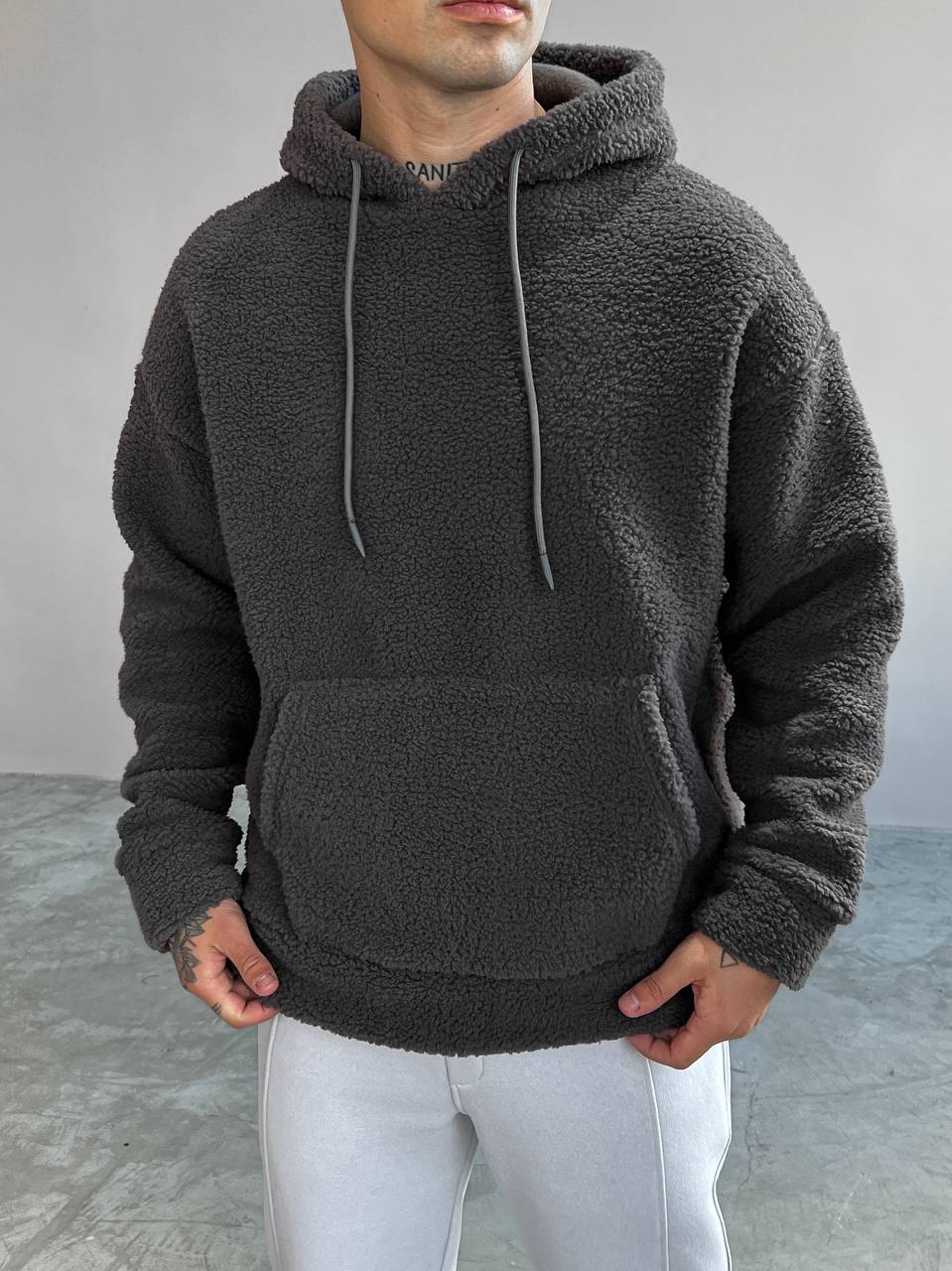 Мужское Плюшевое Графитовое Худи Кенгуру Оверсайз