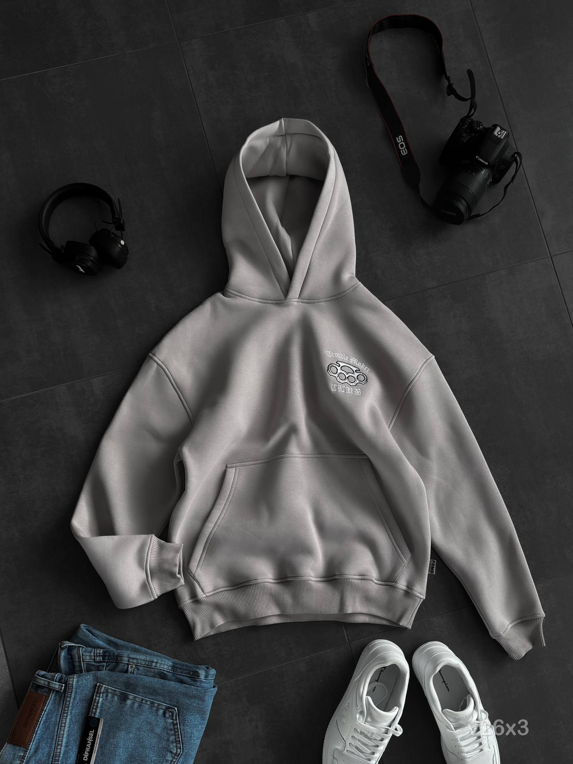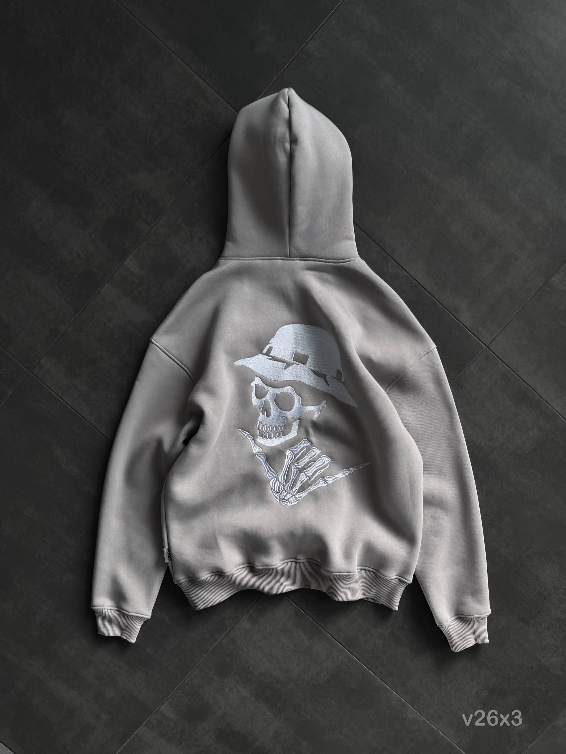 Мужское Серое Худи Оверсайз с Вышивкой Скелет (На Флисе)