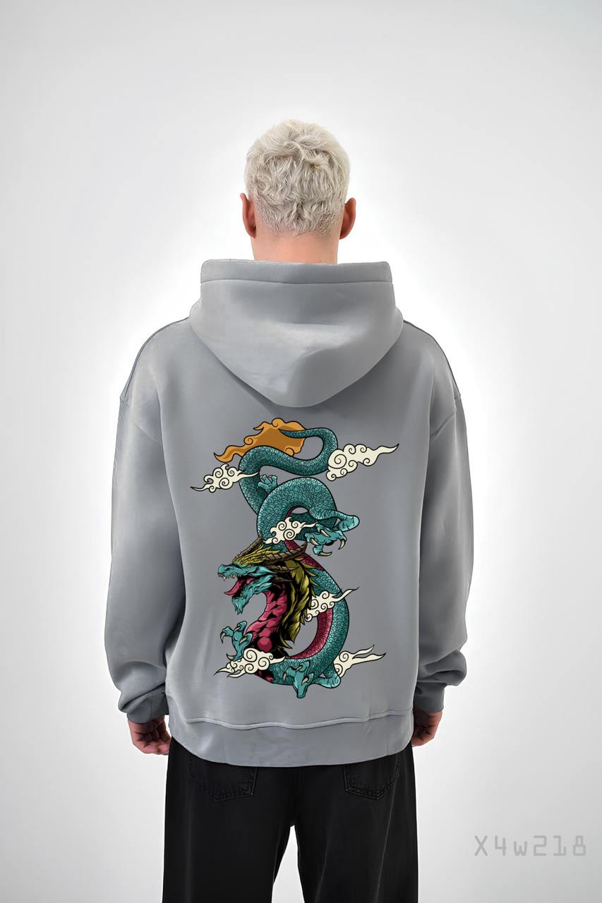 Мужское Серое Худи Свободного Кроя с Принтом Дракон – Трехнитка на Флисе