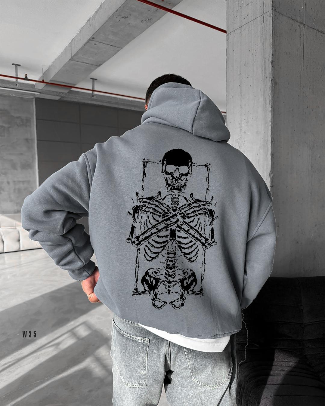 Мужское Серое Худи Свободного Кроя с Принтом Скелет – Трехнитка на Флисе