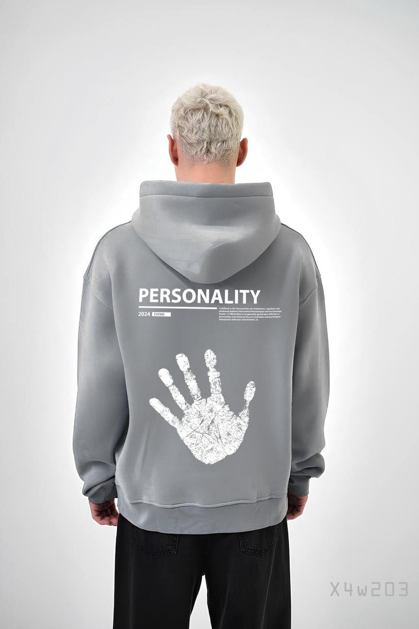 Мужское Серое Худи Свободного Кроя Трехнитка на Флисе с Принтом Рукой