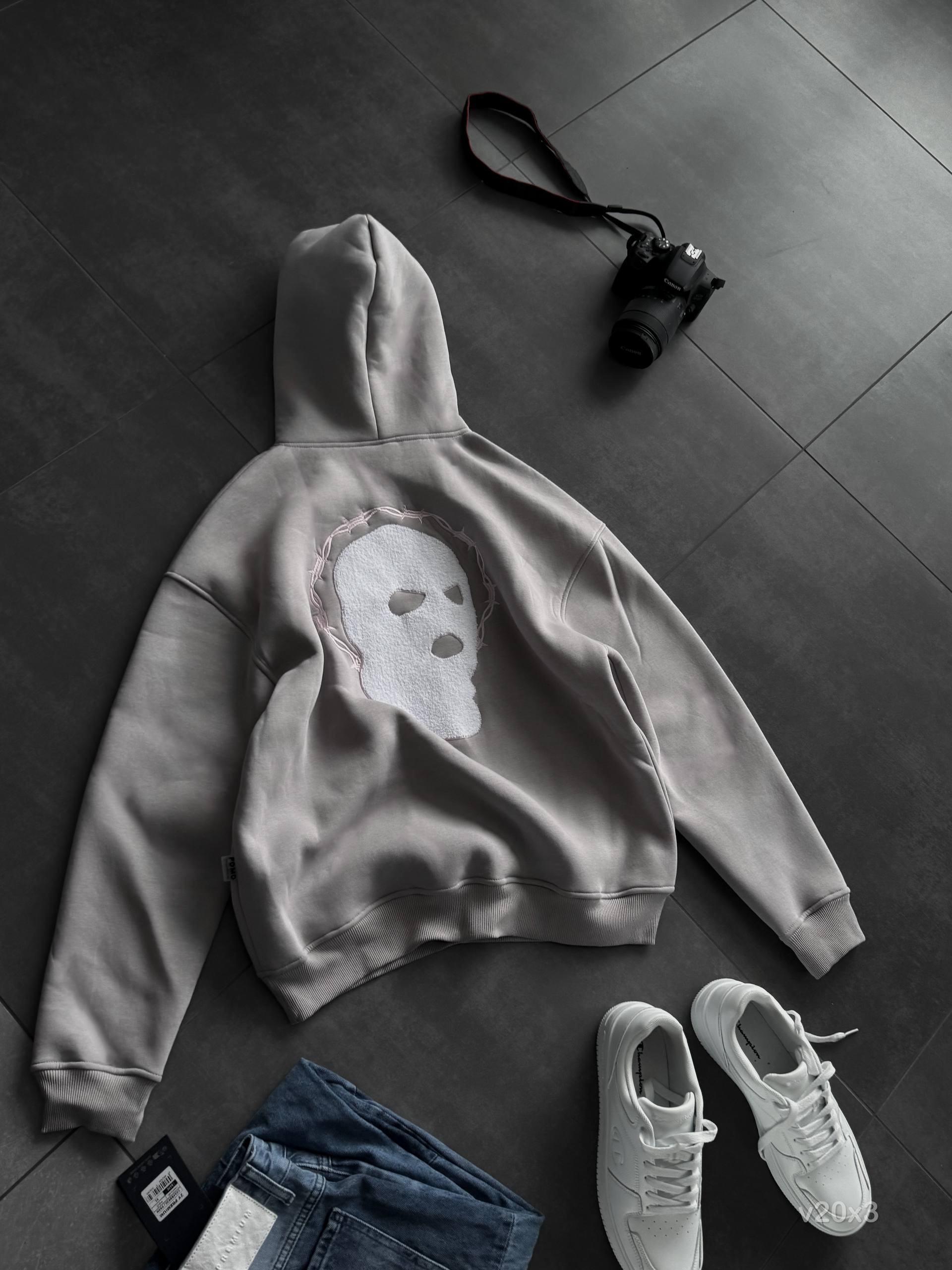 Мужское Серое Худи Утепленное на Флисе – Оверсайз с Вышивкой на Спине