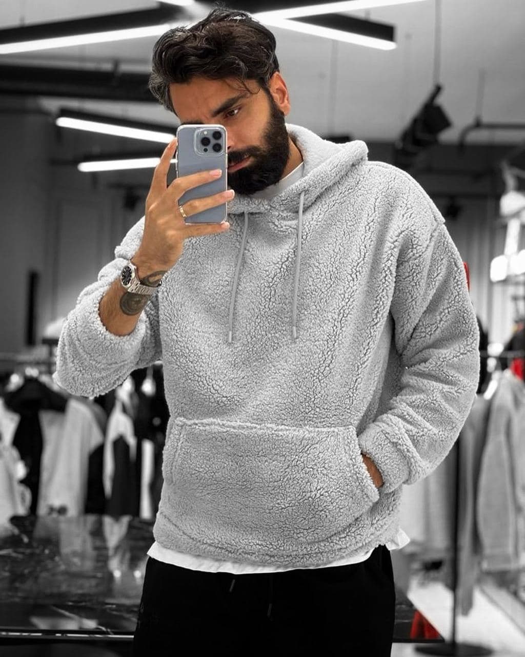 Мужское Светло-Серое Плюшевое Худи – Плюшевая Кофта Оверсайз