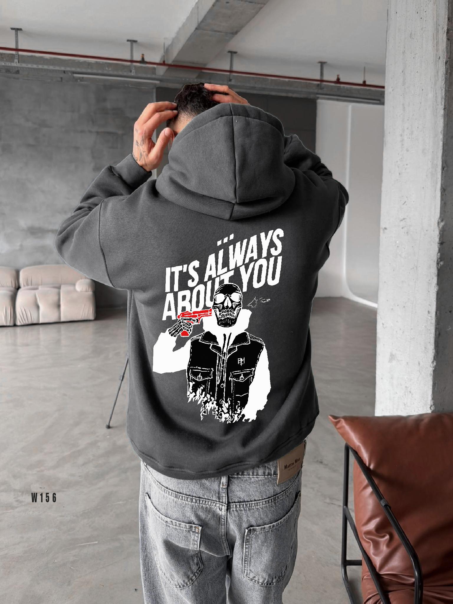 Мужское Темно-Серое Худи Свободного Кроя “It’s Always About You” – Трехнитка на Флисе
