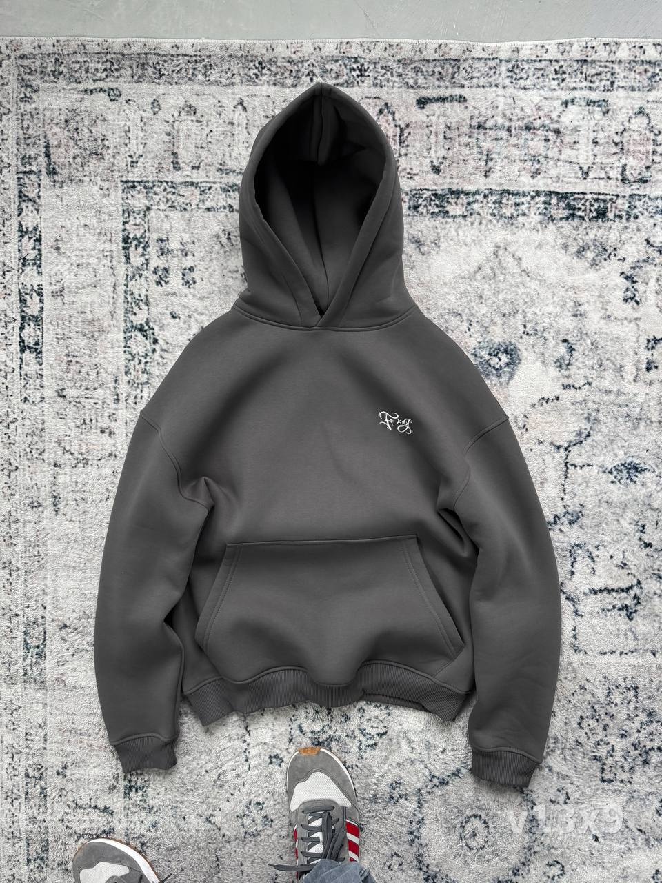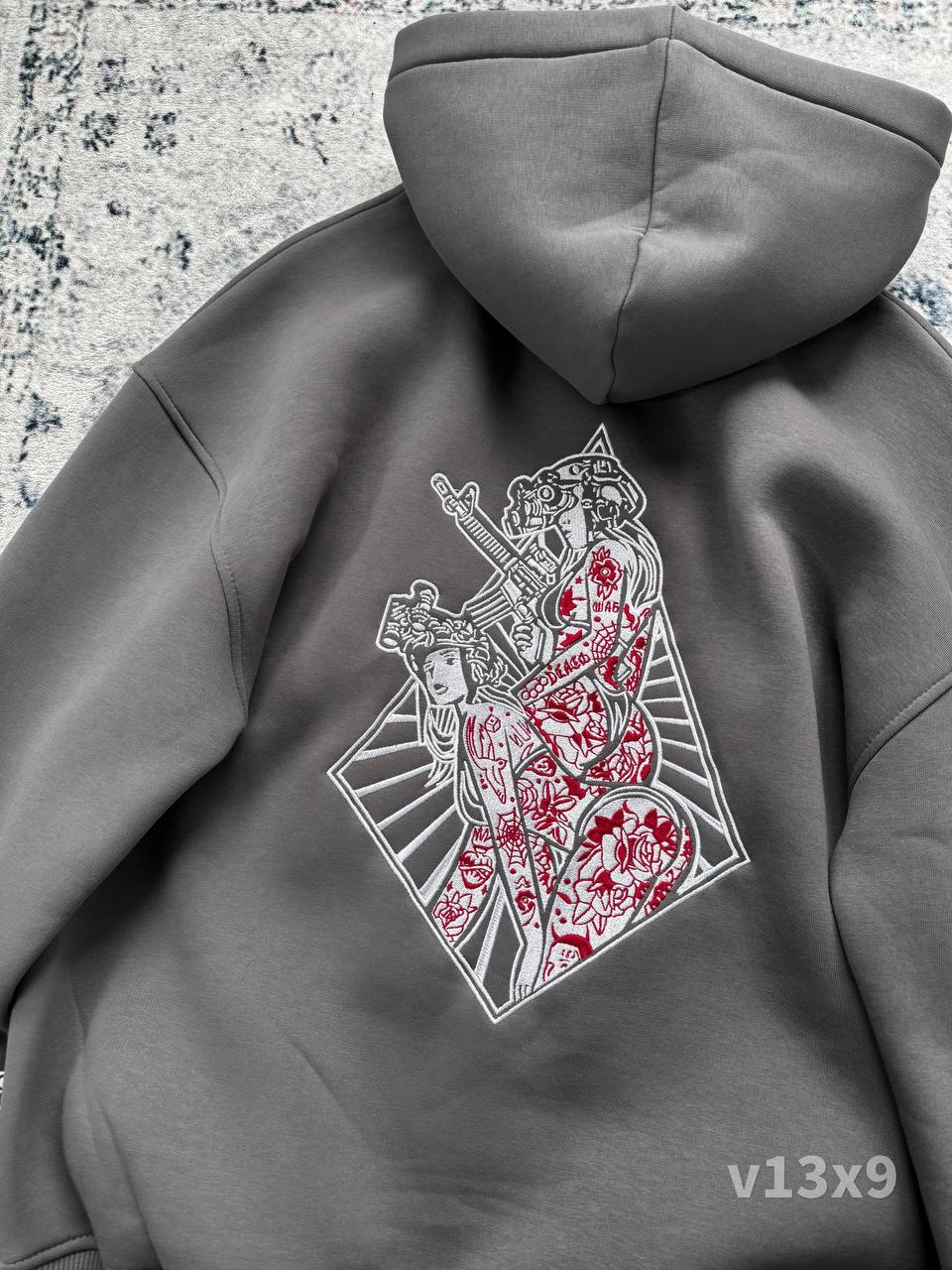 Мужское Темно-Серое Худи Трехнитка Свободного Кроя с Вышивкой Девушки