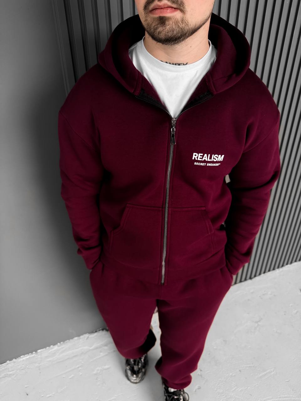 Мужское Теплое Бордовое Зип Худи с Начесом – Кофта Зипка на Молнии с Надписью на Спине
