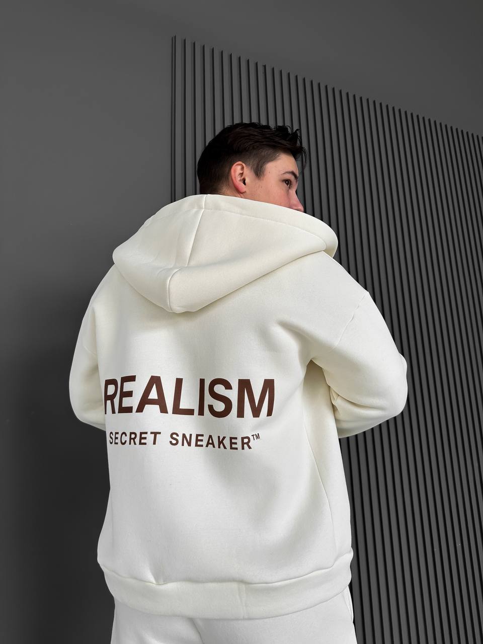 Мужское Теплое Молочное Зип Худи с Начесом – Кофта Зипка на Молнии с Надписью на Спине