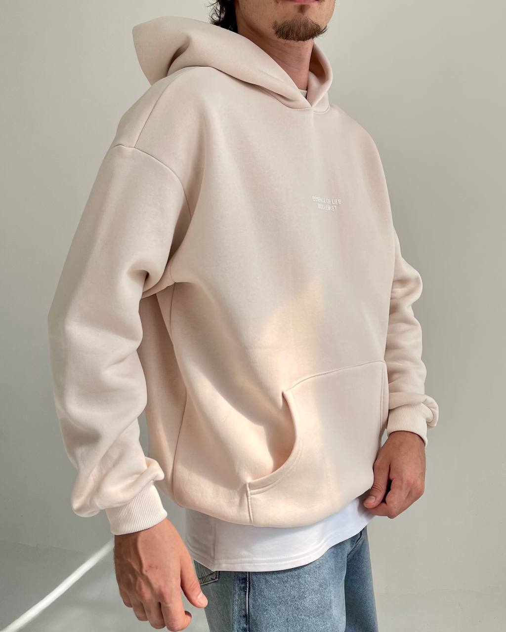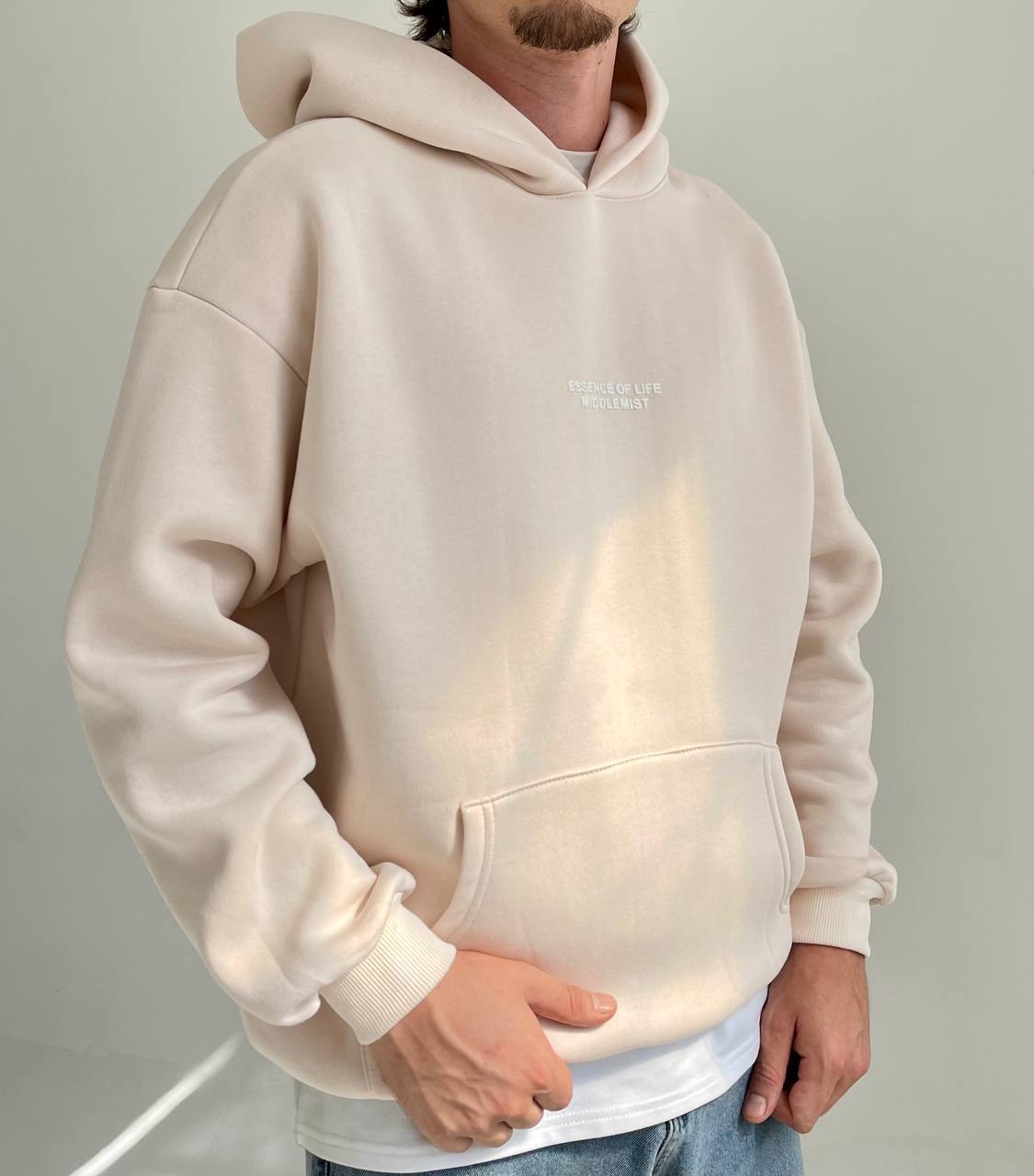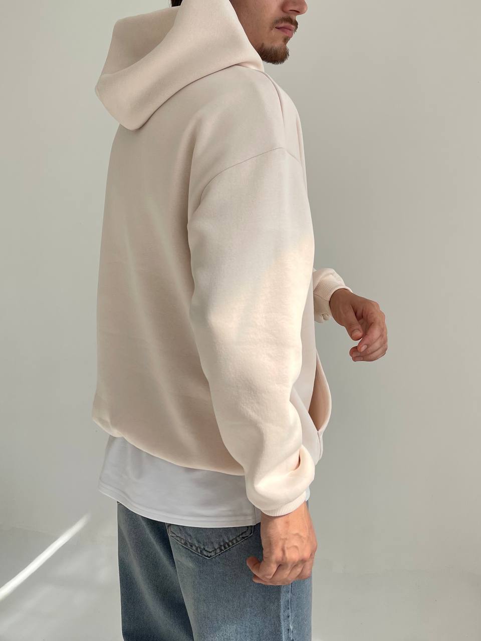 Мужское Утепленное Бежевое Худи Оверсайз – Толстовка на Флисе